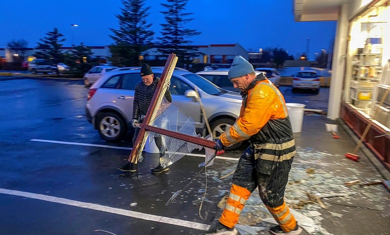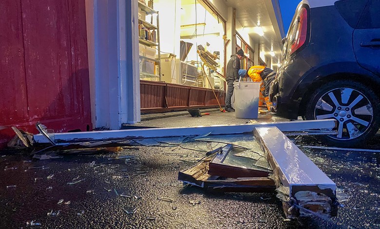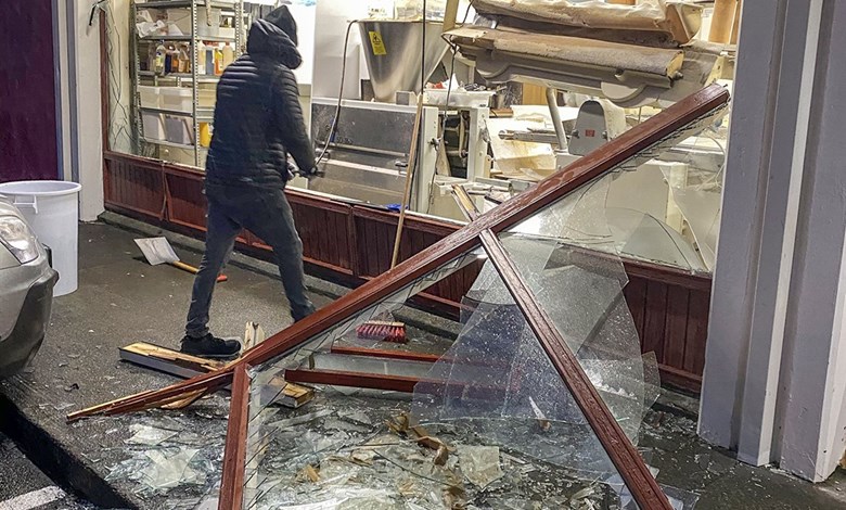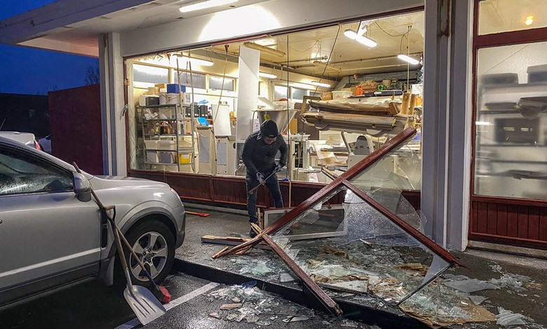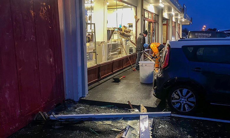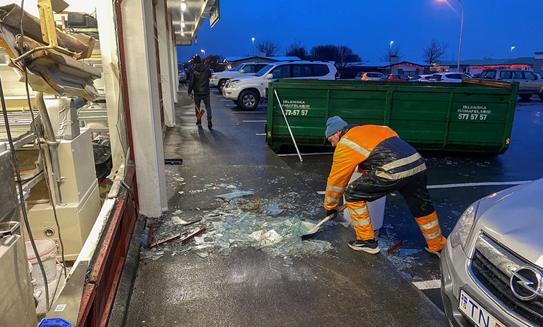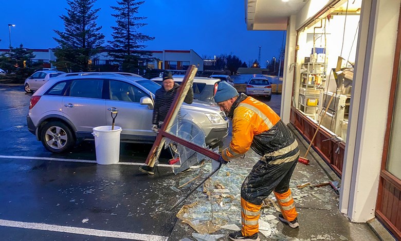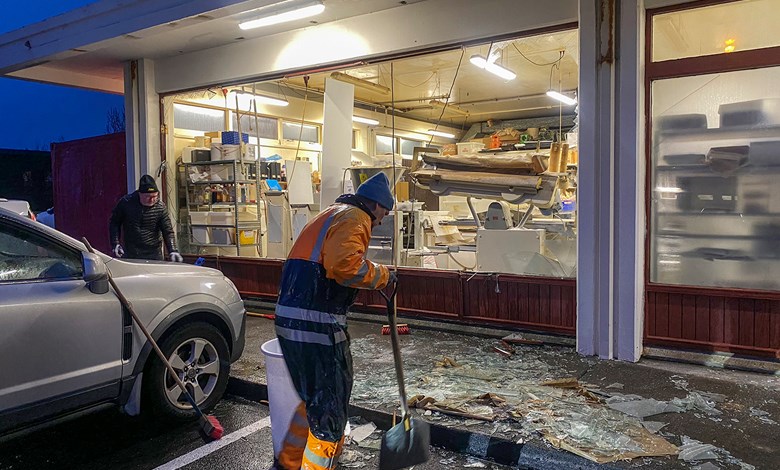 Aðkoman að vettvangi við bakaríið var eins og sprengin hafi orðið inni í bakaríinu. Smiðir sem voru komnir á vettvang segjast aldrei hafa séð annað eins. Þeirra verk hefur verið í morgun að heinsa upp gler og svo þarf að slá upp grind og klæða.