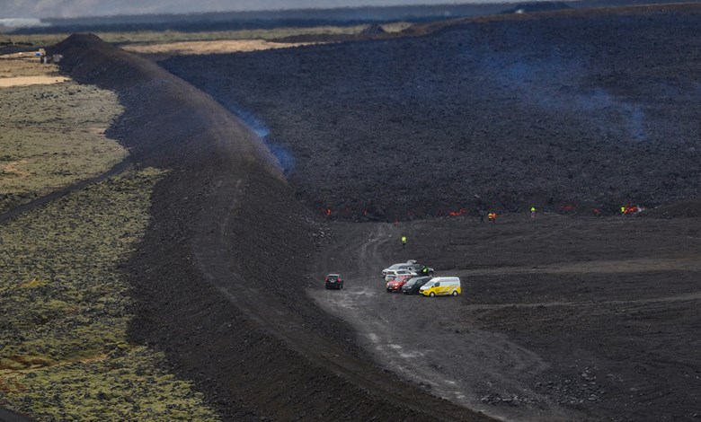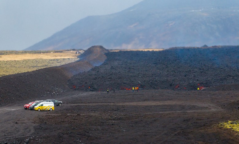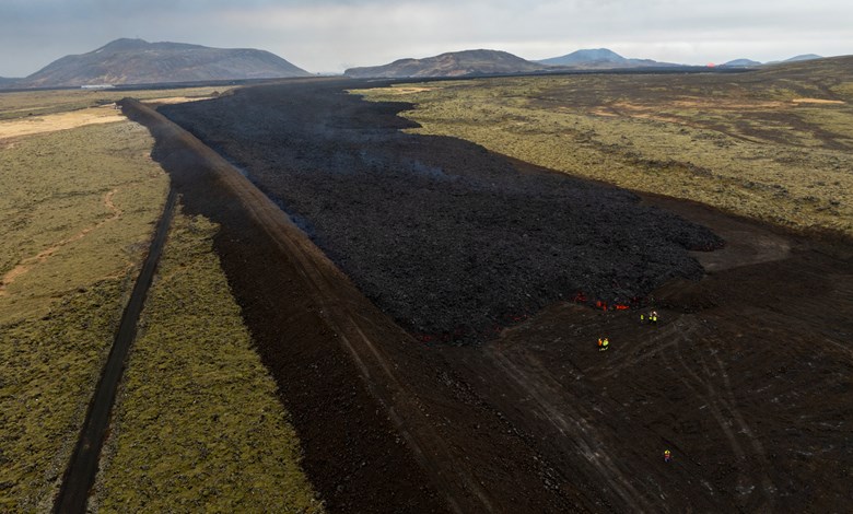 Verulega hefur dregið úr hraða á rennsli á hrauntungunni sem rennur í átt að Suðurstrandarvegi austan Grindavíkur. Hraunið er þó enn á hreyfingu og möguleiki á að það renni niður að veginum.