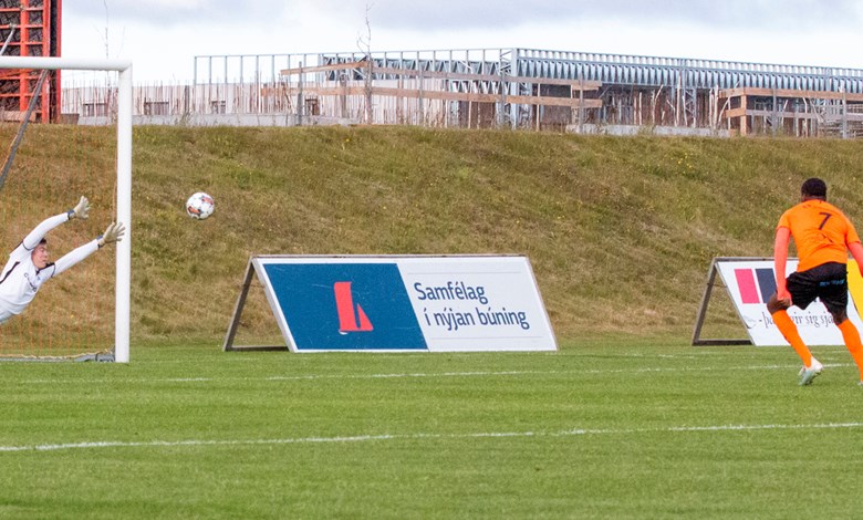 Gestirnir urðu fyrir áfalli á 35. mínútu þegar brotið var á nýjasta leikmanni Þróttar, Hans Kamta Mpongo, sem lék sinn fyrsta leik með liðinu í gær. Mpongo reyndi að ná til fyrirgjafa í markteig Grindvíkinga en lenti í samstuðu við varnarmann, féll við og vítaspyrna dæmd. Ppongo tók vítið sjálfur og kom Þrótti í forystu. Hann þurfti reyndar tvær tilraunir en endurtaka þurfti vítið þar sem leikmenn voru farnir af stað inn í teig áður en spyrnan var tekin – Mpongo skoraði samt úr báðum tilraunum.