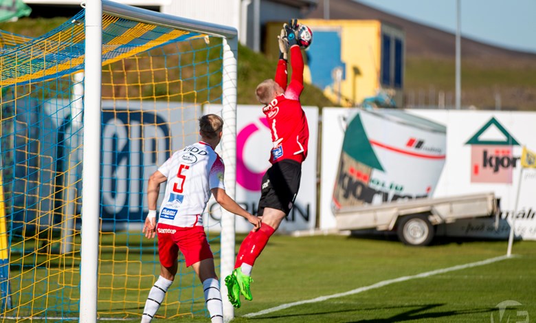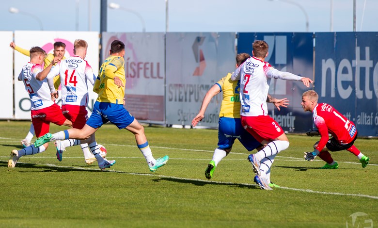 Fjölnismenn voru nærri því að taka forystuna snemma í leiknum. Þeir sóttu að marki heimamanna og náðu góðu skoti utan teigs sem Walid Birrou Essafi varði vel. Gestirnir fengu hornspyrnu og upp úr henni áttu þeir sláarskot, boltinn féll fyrir sóknarmann rétt við marklínu og virtist vera að klára dæmið og skalla boltann í netið en á ótrúlegan hátt komst Gísli Martin Sigurðsson fyrir boltann og bjargaði á línu.