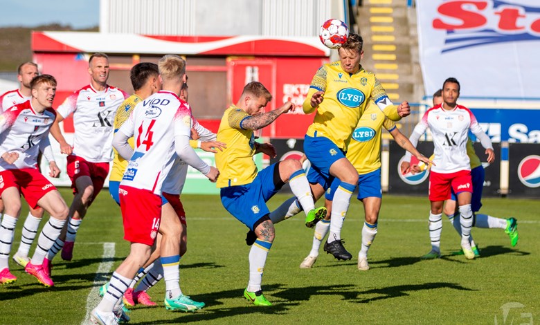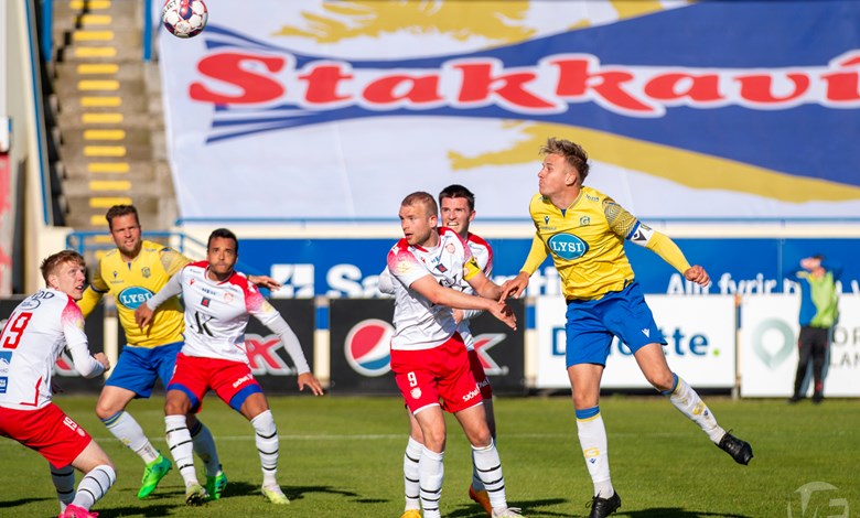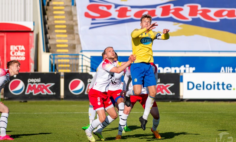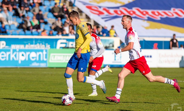 Það gekk á ýmsu þessar lokamínútur fyrri hálfleiks því Bjarni fékk svo beint rautt spjald í uppbótartíma þegar hann fór með sólann í tæklingu við Joao Ananias Jordao Junior sem lá eftir.