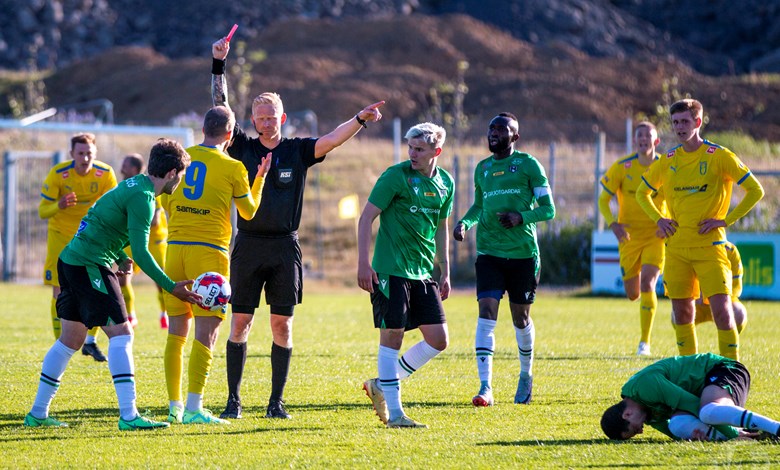 Njarðvíkingar sóttu áfram og aftur var Hreggviður á ferðinni, hann lék laglega inn að teig gestanna en missti boltann frá sér og var aðeins of seinn í tæklingu við varnarmann. Hreggviður var á gulu spjaldi og fékk þarna að líta sinn annað gula spjald og því rauttt.