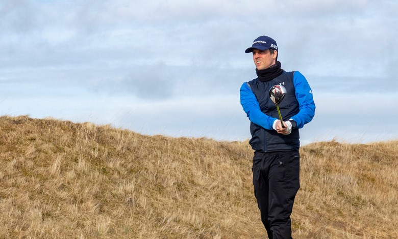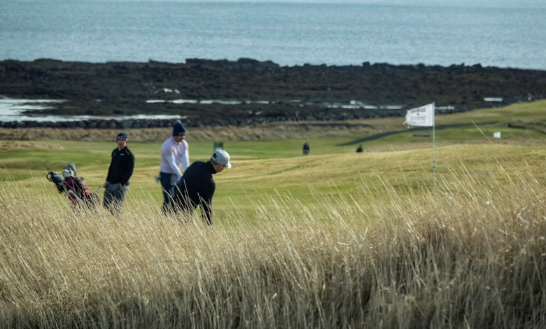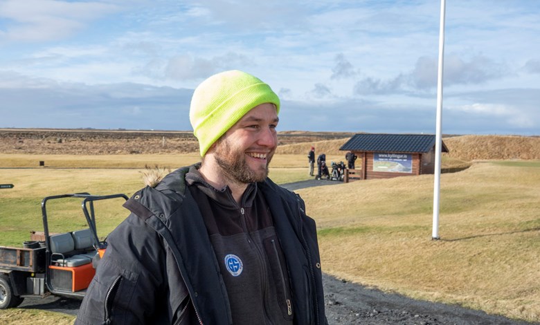 Meðal kylfinga sem voru mættir á teig í Leirunni í morgun var landsliðs knattspyrnumaðurinn Kári Árnason. Hann lenti í smá vandræðum á fyrsta teig en gekk þó brosandi út á völl eins og fleiri kylfingar.