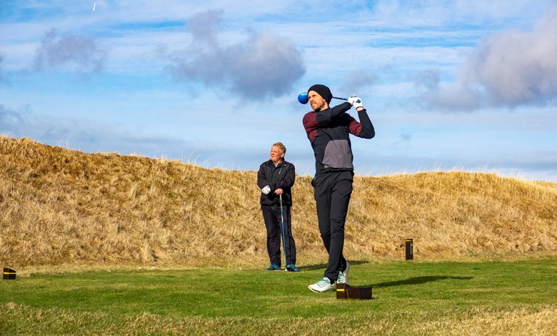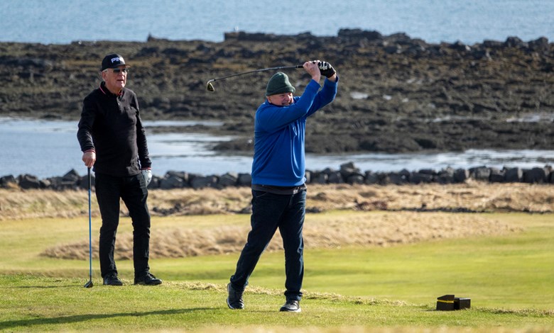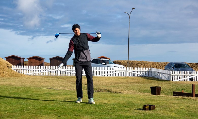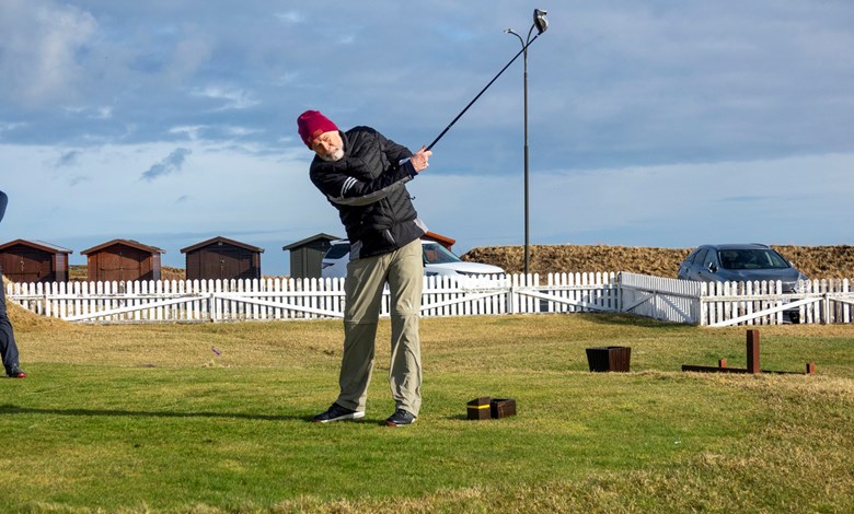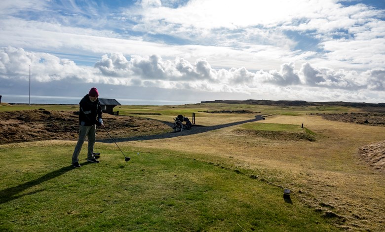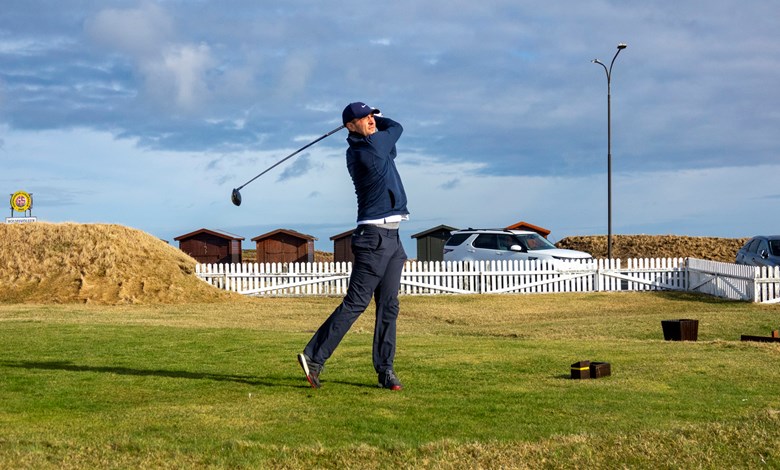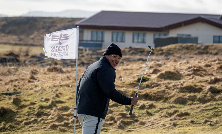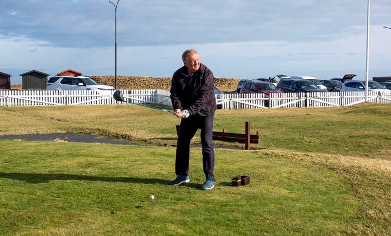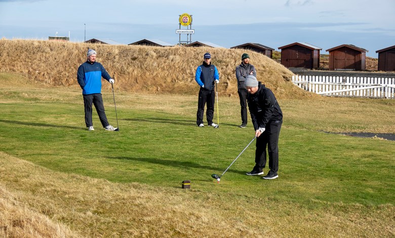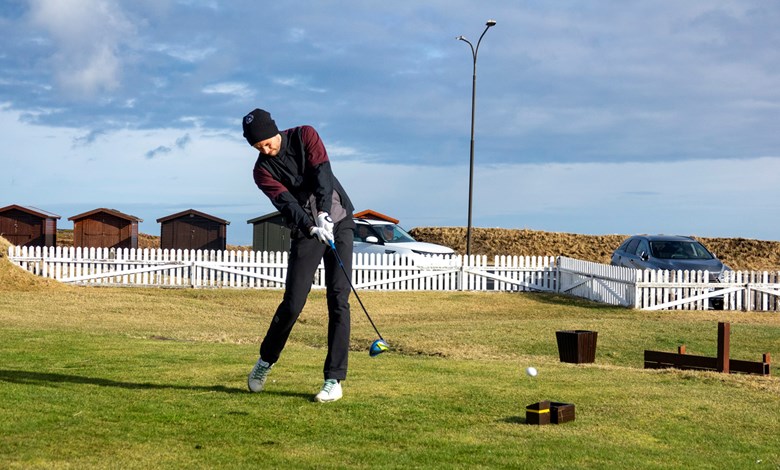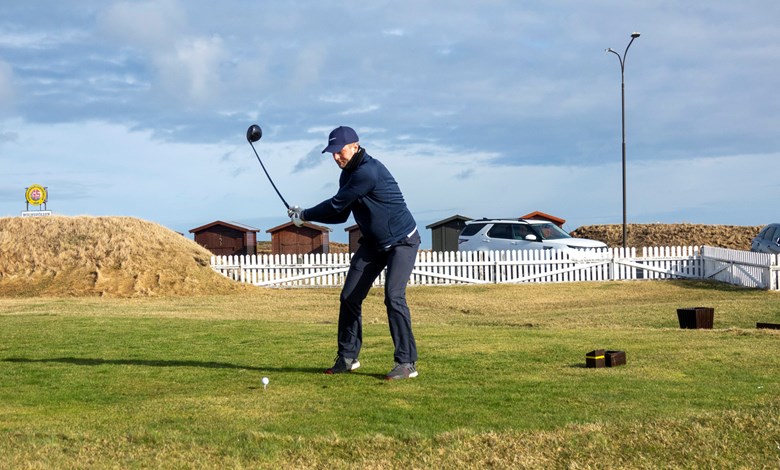 Kári slær á fyrsta teig. Höggið fór ekki alveg rétta leið og landsliðsmaðurinn í knattspyrnu tók annað högg skömmu síðar.