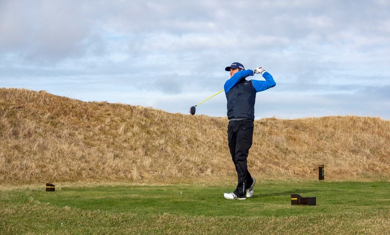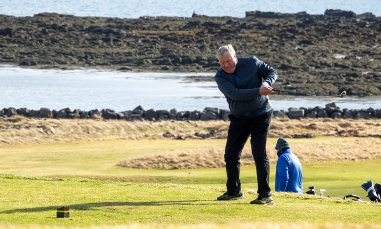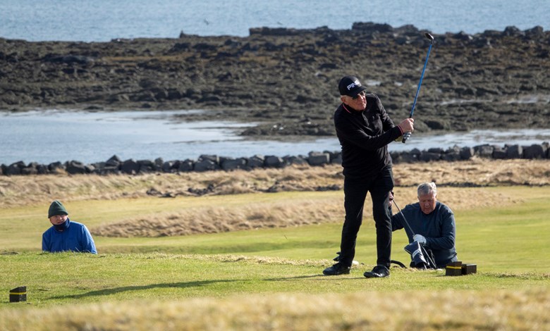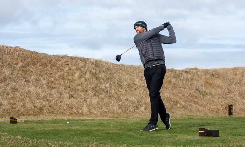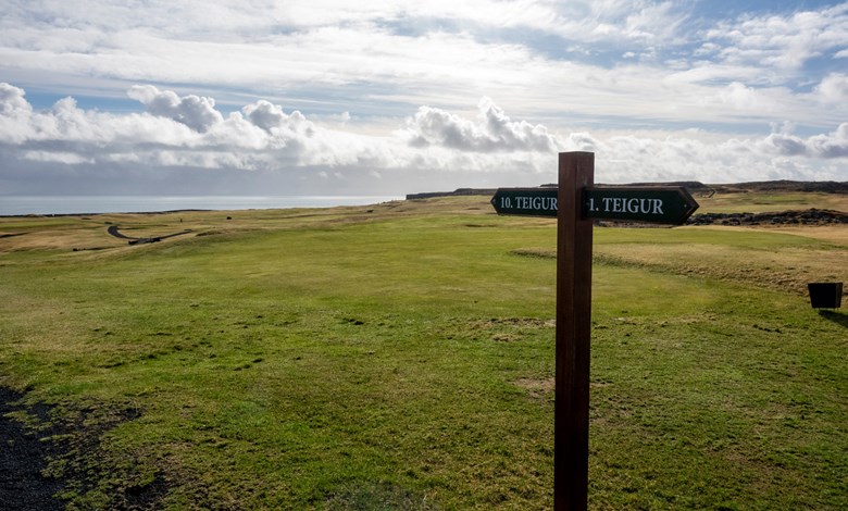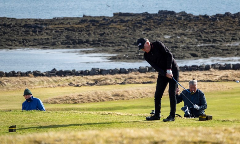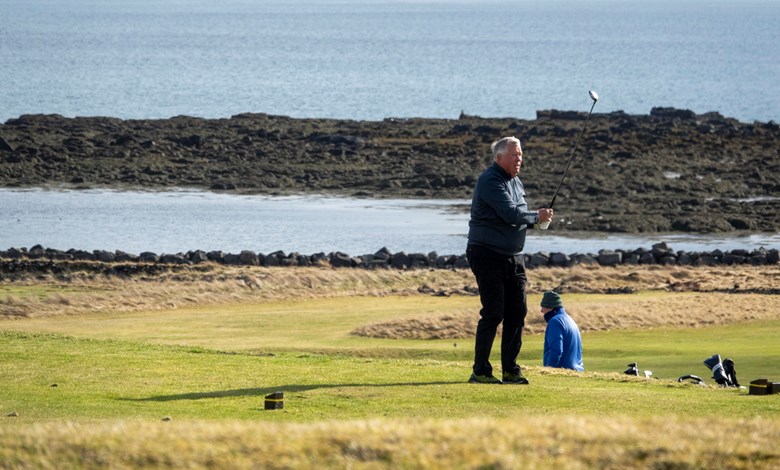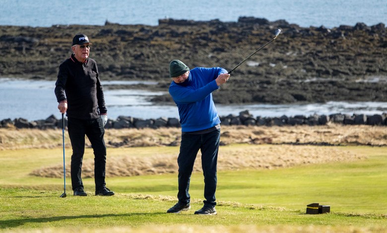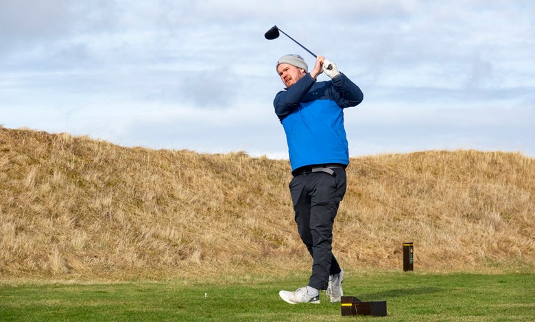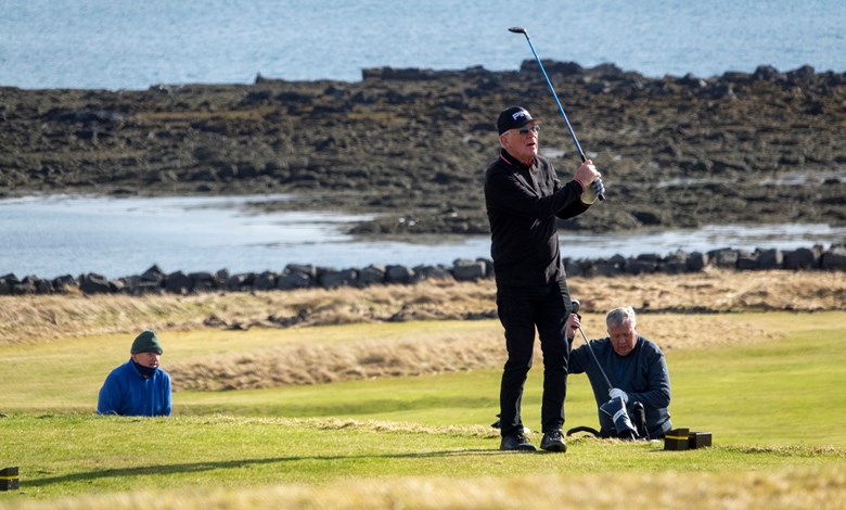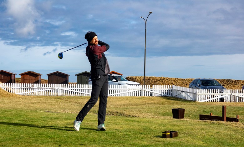 Kári slær á fyrsta teig. Höggið fór ekki alveg rétta leið og landsliðsmaðurinn í knattspyrnu tók annað högg skömmu síðar.