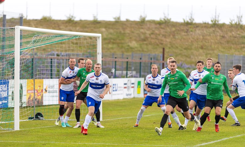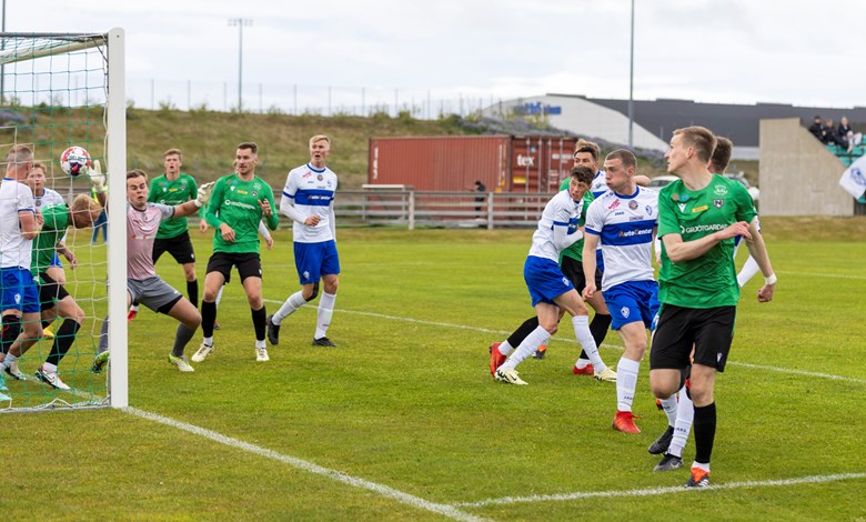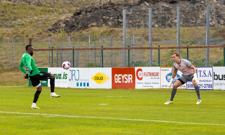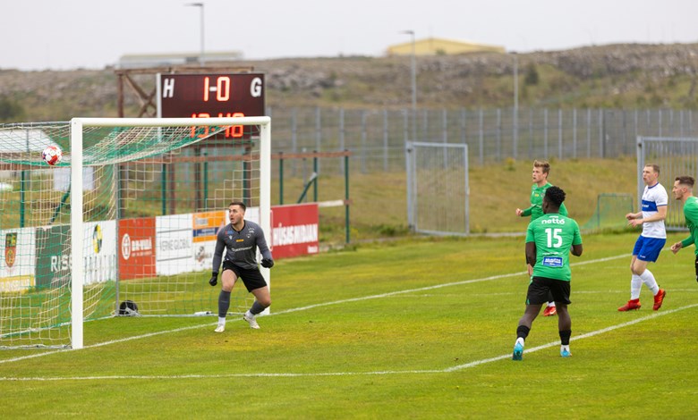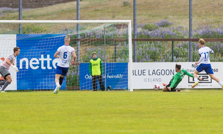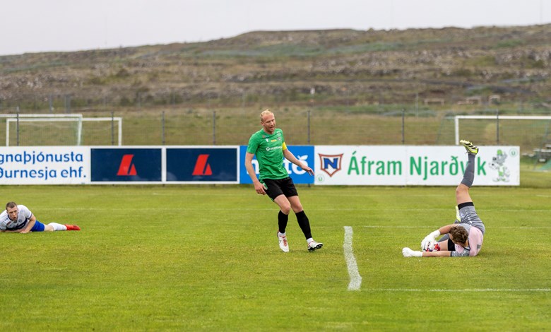 Skömmu síðar sækja Njarðvíkingar hratt og Skotarnir Kenneth Hogg og Marc McAusland eltu stungusendingu upp að endamörkum þar sem Hogg vann hornspyrnu. Oumar Diouck tók hornið og sendi á nærstöng þar sem Arnar Helgi stakk sér fram fyrir pakkann og fleytti boltanum í markið (21').