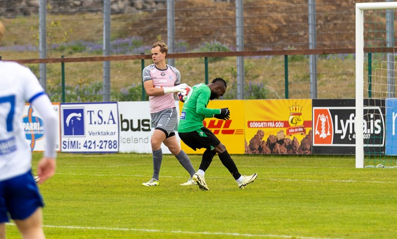 Eftir rúmlega korters leik sendi Arnar Helgi Magnússon frábæra sendingu frá eigin vallarhelmingi inn fyrir vörn ÍR beint á Oumar Diouck sem var einn á auðum sjó sem náði ekki almennilegu valdi á boltanum og reyndi að vippa yfir markvörð gestanna. Diouck er vanur að nýta svona færi en í þetta skipti tókst honum ekki betur upp en svo að boltinn fór beint í hendurnar á markverðinum og dauðafæri í súginn.