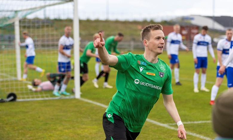 Jóhann Þór Arnarsson var á skotskónum í gær þegar hann skoraði bæði mörk Þróttar (10' og 38') sem vann mikilvægan 2:0 sigur á Reyni í annarri deild karla.