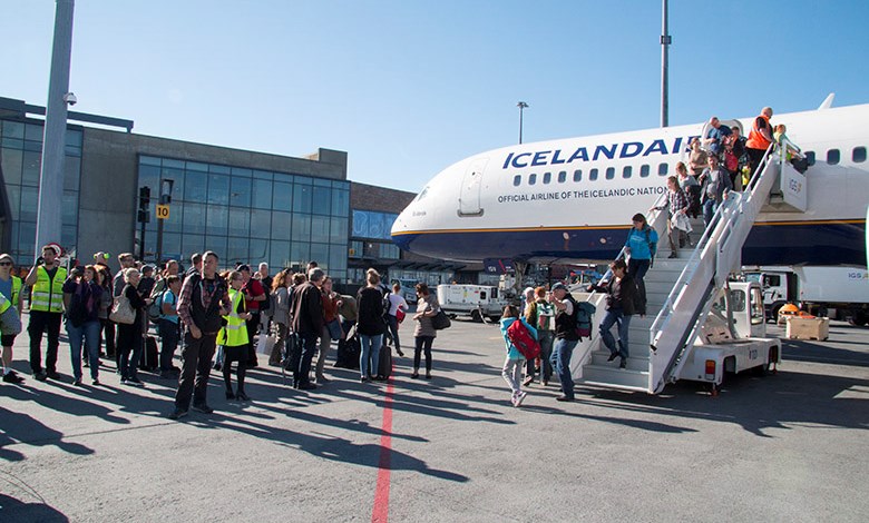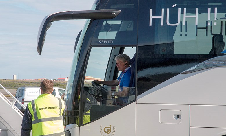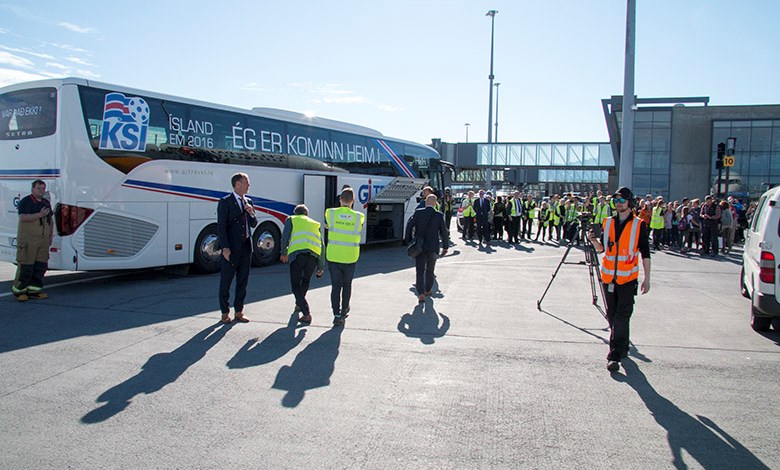 Það var sannkölluð stjörnustemmning þegar íslensku landsliðsmennirnir stigu út úr Grábrók, Boeing vél Icelandair á Keflavíkurflugvelli nú síðdegis eftir frækilega frammistöðu á EM í Frakklandi. Landsliðsmennirnir og hópur liðsins fór með rútu frá Keflavíkurflugvelli til miðborgar Reykjavíkur. Hópurinn fékk í leiðinni góðar kveðjur á Fitjum í Njarðvík þar sem hópur fólks fagnaði drengjunum á leið þeirra til Reykjavíkur.