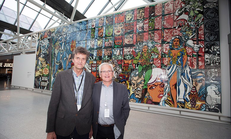 Verktakafyrirtækið Húsagerðin í Reykjanesbæ fékk það vandasama verk að setja upp listaverkið hans Erró. Myndin er samsett með 2500 flísum. Þær voru límdar á platta sem síðan voru settir saman í þessari stóru uppsetningu. Á myndinni eru Birgir Vilhjálmsson og Agnar Áskelsson frá Húsagerðinni fyrir framan verkið.