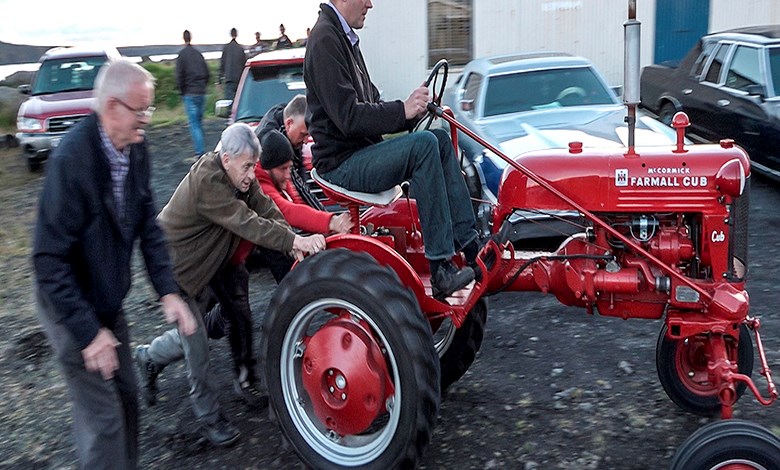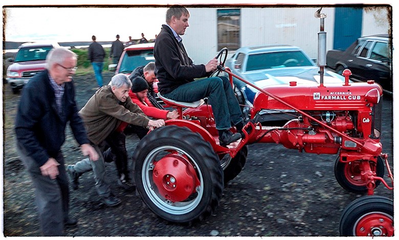Þar sem hópurinn stóð yfir ameríska drekanum barst skyndilega verkefni. Gamall Farmall Cub sem stóð fyrir utan félagsheimilið neitaði að fara í gang. Sérfræðingar í hópnum skoðuðu gripinn og ákveðið var að ýta honum í gang. Þar sem hópurinn var kominn út úr húsi þá hófst sögustund á bílastæðinu, vélarhlífar voru rifnar upp og við blöstu glansandi mótorar og greinilegt að mikil natni er lögð í hlutina.