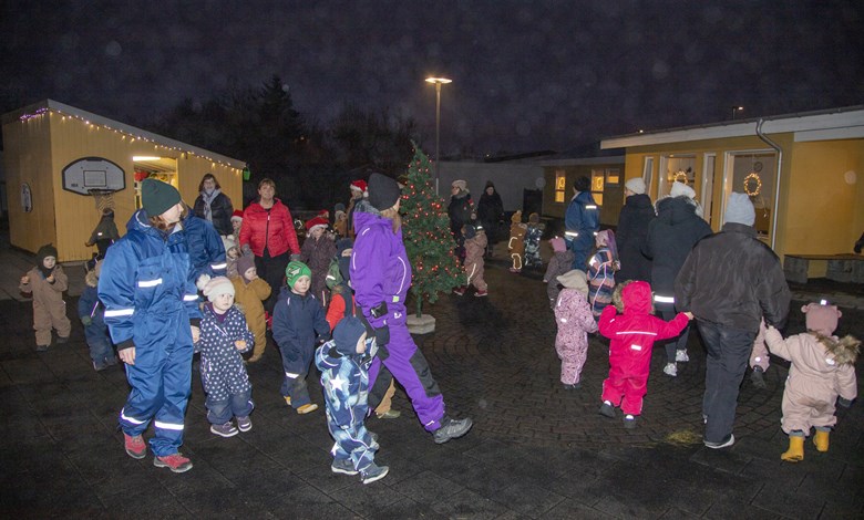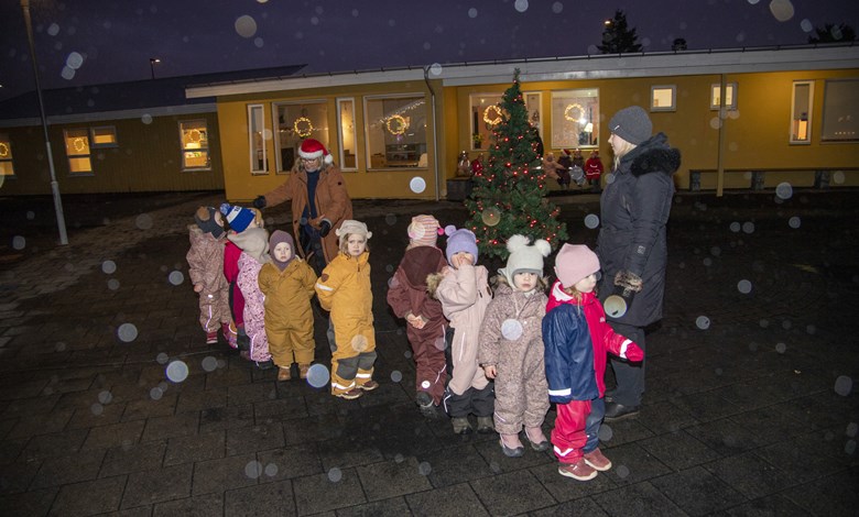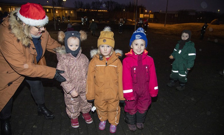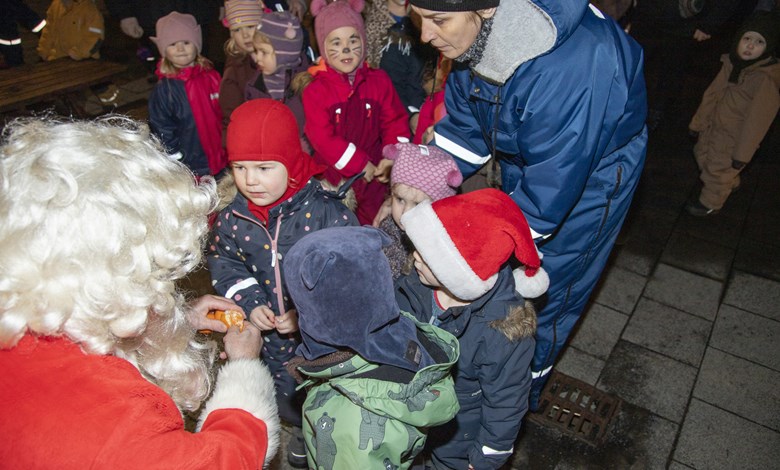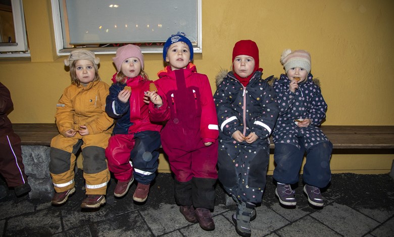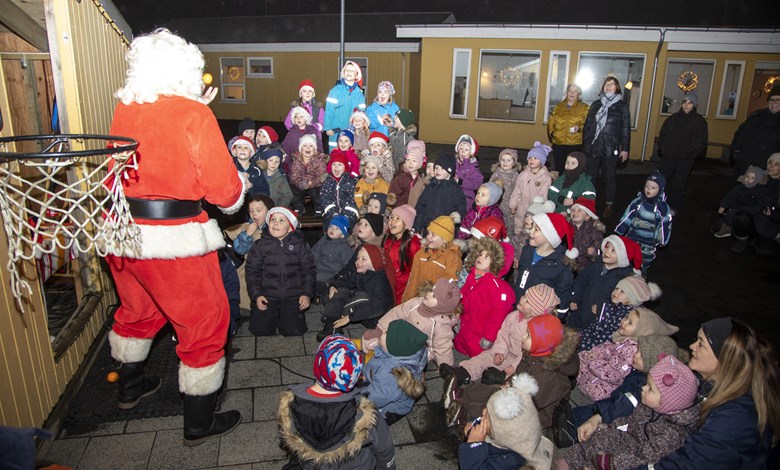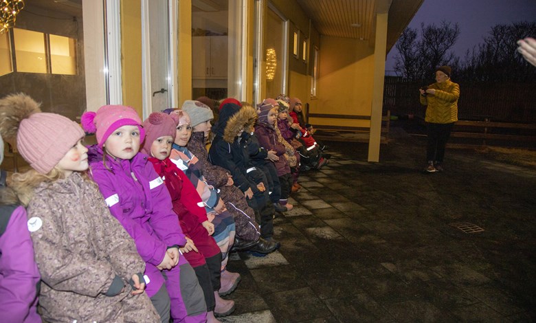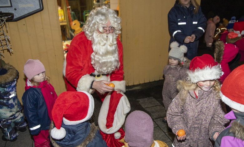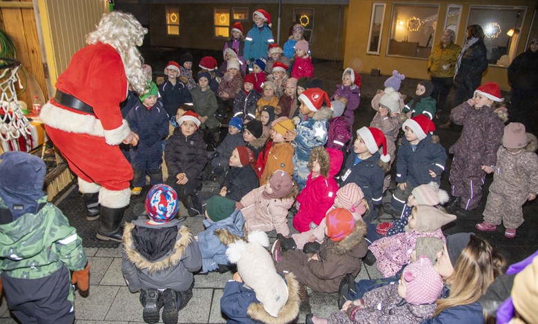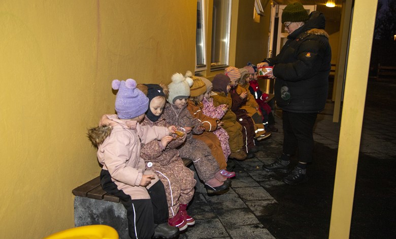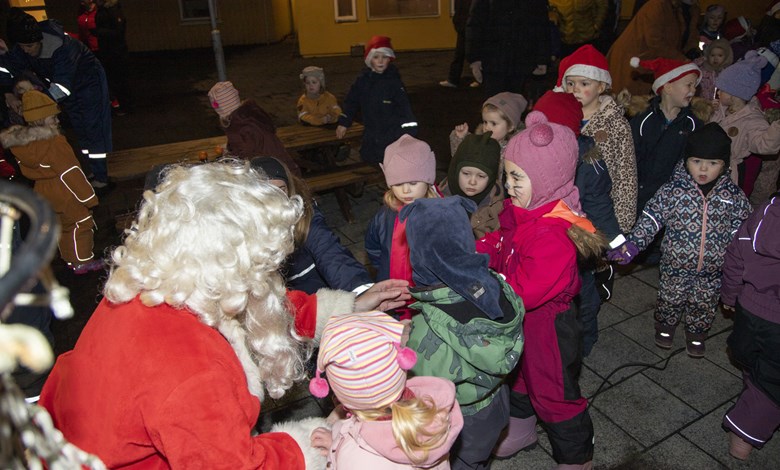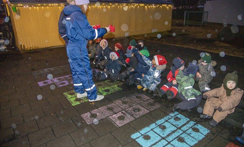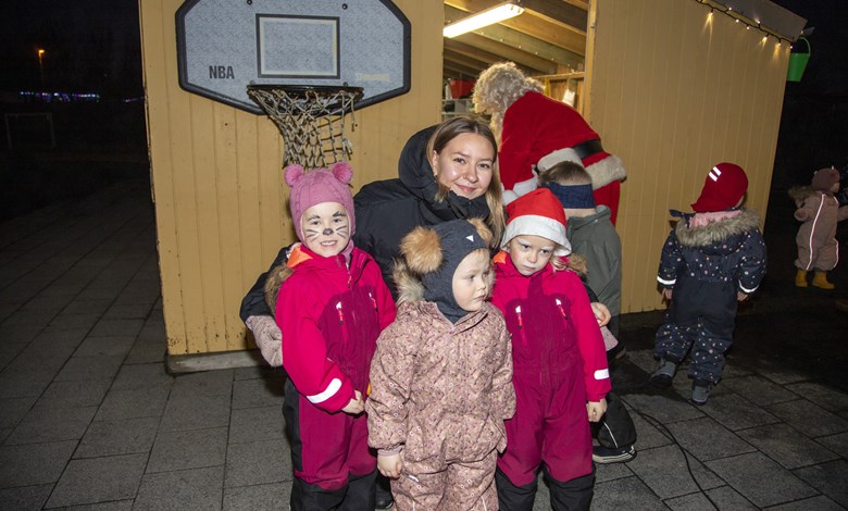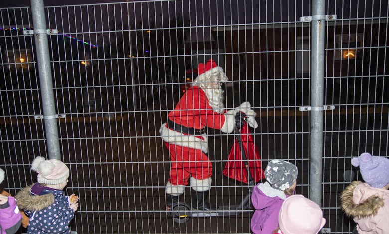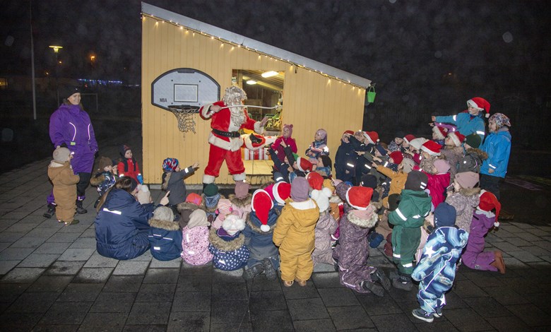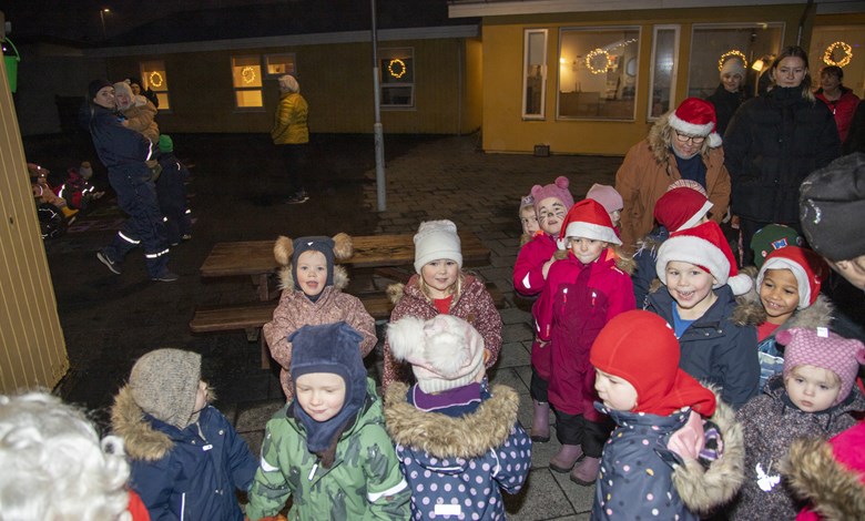 Það var skemmtileg jólastemmning í góðu veðri þegar sá rauðklæddi kom á rafhlaupahjólinu. Hann gaf krökkunum mandarínu og ræddi við þau. Mörg voru forvitin og spurðu hann spurninga. Leikin voru jólalög og gengið í kringum jólartré á útisvæðinu og svo fengu krakkarnir piparkökur og kakó.