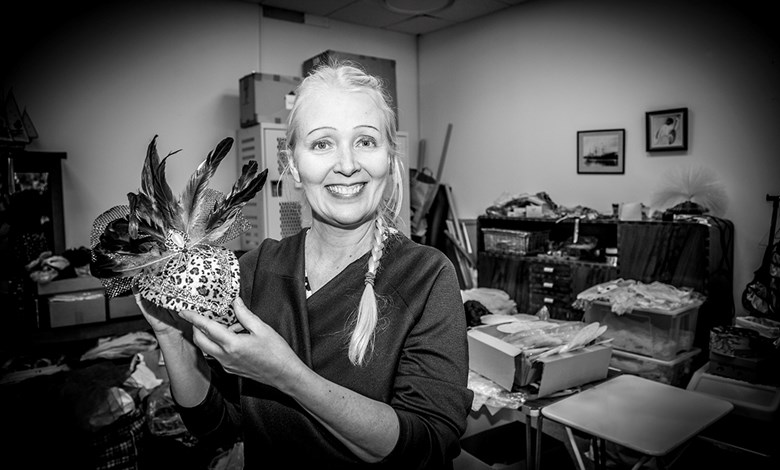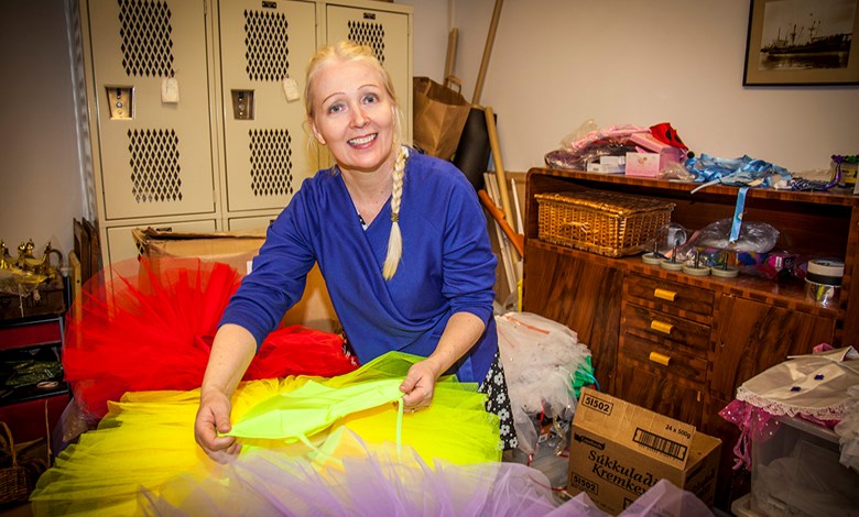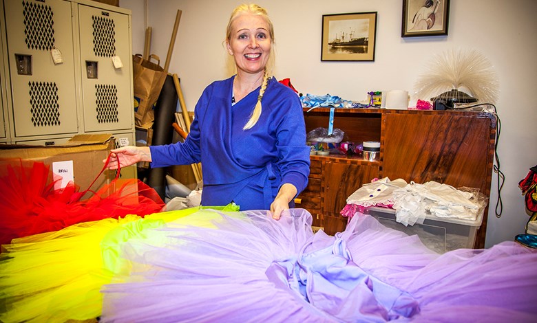 Við göngum um gangana í BRYN Ballett Akademíunni en skólinn er staðsettur í risastórri braggabyggingu rétt hjá gamla kanasjúkrahúsinu á Ásbrú, ótrúlega flott húsnæði með þremur danssölum, dansbókasafni og dansverslun. Þegar komið er inn í búningageymsluna þá byrjum við að gramsa því herbergið er svo skemmtilegt, fullt af litríkum dansbúningum og fylgihlutum. Þetta er nú eitthvað fyrir listaspírur að koma þarna inn.