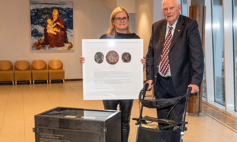 „Tilefni þessarar móttöku er formleg afhending gjafar á myntsafni mínu til Barnaskólans í Keflavík, Myllubakkaskóla. Gjöfin er til minningar um foreldra okkar, þeirra Guðlaugar Stefánsdóttur og Eyjólfs Guðjónssonar, Stuðlabergi, hér í Keflavík. Það er ljúft að minnast ábendinga þeirra í uppvextinum og áherslum til sækja fram í lífinu, s.s. þegar ég var fermdur og búinn að fá vinnu í frystihúsi þá var mér tilkynnt að ef ég legði fyrir tekjurnar mínar og notaði þær til að mennta mig þá þyrfti ég ekki að greiða til heimilisins. Þetta var grunnurinn að því að ég gat farið rúmlega 16 ára í skóla í Reykjavík og séð um mig, en enginn gagnfræðaskóli var þá til hér í Keflavík.