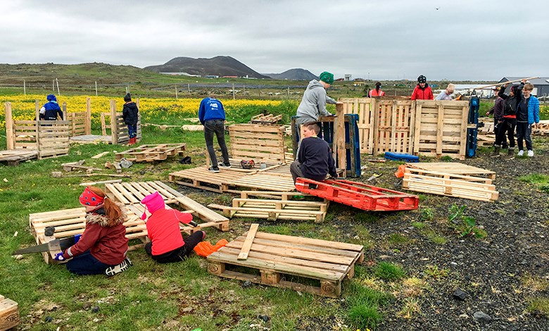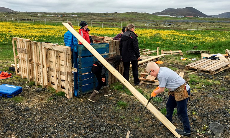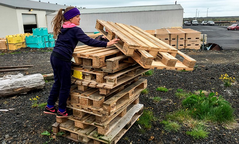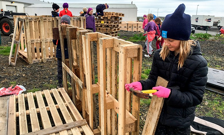 Gömul vörubretti eru uppistaðan í byggingarefninu en einnig hefur Hjalti þurft að fara nokkrar ferðir í BYKO í Reykjanesbæ til að taka með alvöru timbur til kofabyggina.