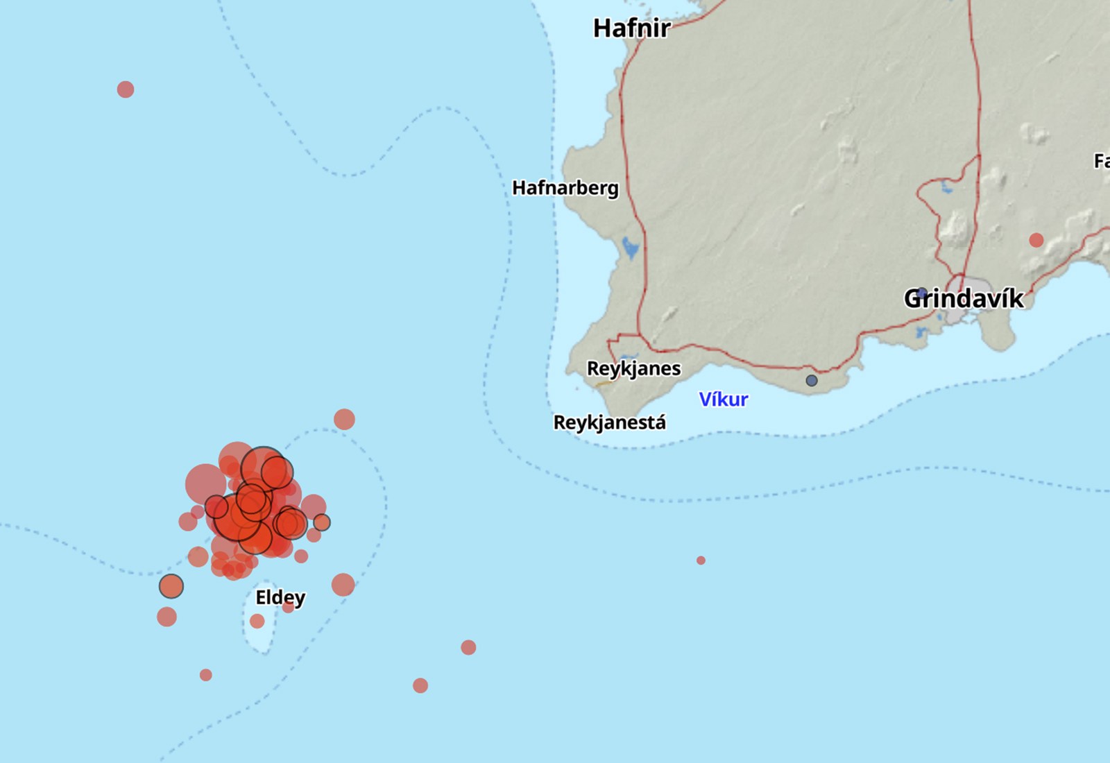 Fremur áköf jarðskjálftahrina hófst við Eldey kl 12:40 í dag 8. febrúar og hafa um 100 skjálftar mælst til þessa, en hrinan stendur enn yfir.