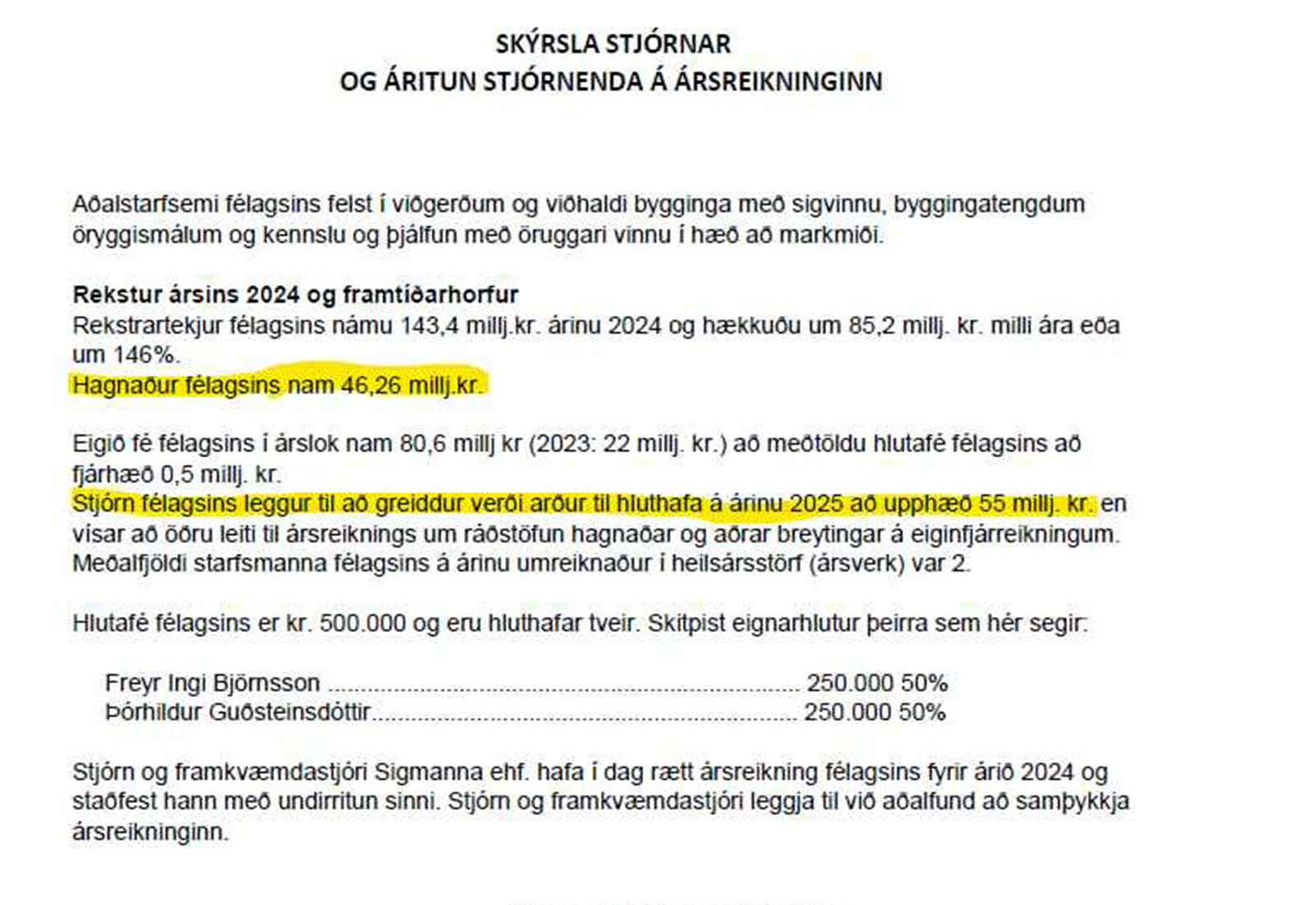 Samkvæmt skýrslu stjórnar í ársreikningnum kemur fram að eigendur fyrirtækisins eru Öryggisstjóri Grindavíkur og eiginkona hans. Stjórn félagsins leggur til að greiddur verði arður til eigenda félagsins að upphæð 55 milljónir.