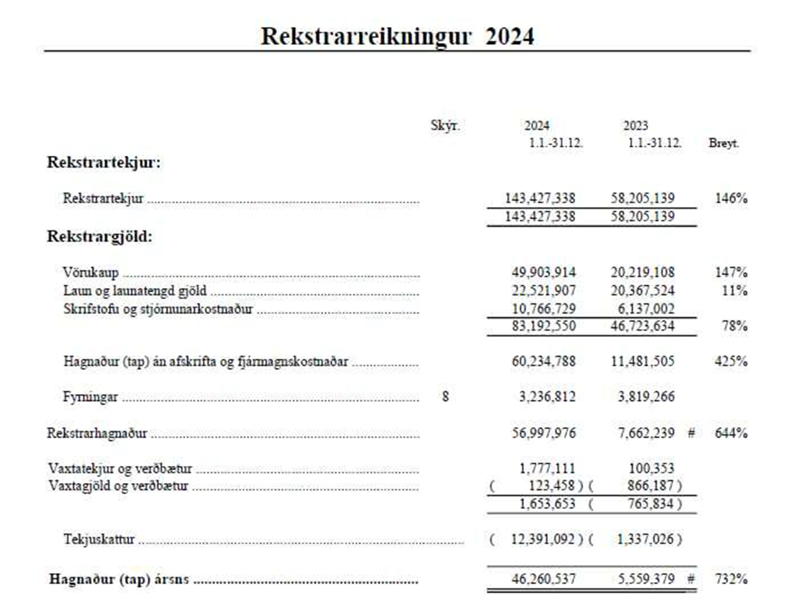 Samkvæmt ársreikningi félagsins voru rekstrartekjur árið 2023 rúmar 58 milljónir en ári síðar, eftir að starfsemi hófst í Grindavík, rúmar 143 milljónir. Hagnaður ársins 2023 var rúmar 5 milljónir en hækkaði upp í rúmar 46 milljónir árið 2024.