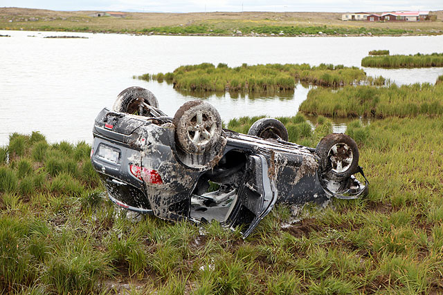 Ökumaður, sem er grunaður um ölvun við akstur, var aðeins hársbreidd frá því að hafna í tjörninni við Sandgerði með ófyrirséðum afleiðingum. Ökumaðurinn velti bifreið sinni í gærkvöldi og hafnaði á toppnum í sefinu á tjarnarbakkanum.