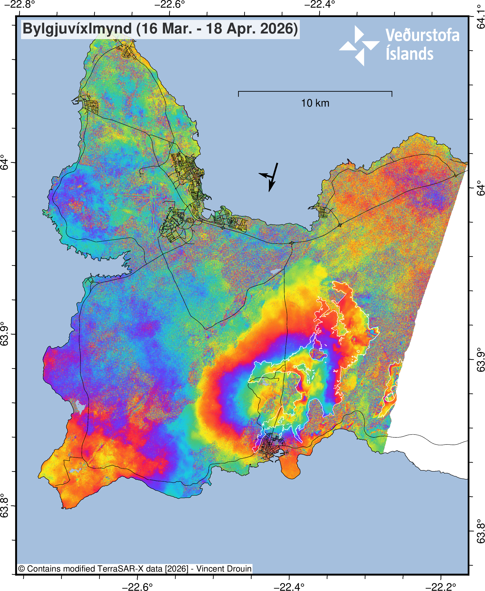 Gervitunglamynd sem spannar tímabilið 16. mars - 18. apríl 2026 og sýnir landris við Svartsengi. Hvítu útlínurnar sýna hraunin sem hafa myndast í fyrri eldgosum á Sundhnúksgígaröðinni.