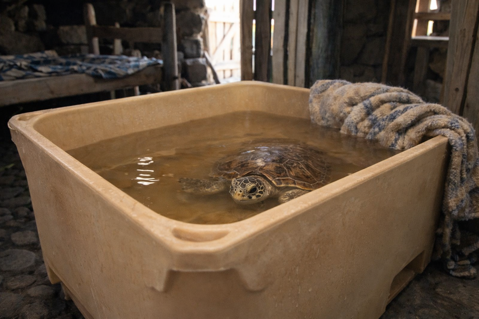 Til að tryggja að dýrinu yrði ekki meint af kuldanum var brugðið á það ráð að koma henni fyrir í stóru fiskikeri með volgu vatni inni í Skessuhellinum. Þar unir hún sér nú vel í skjóli við Skessuna á meðan beðið er eftir flutningi til Reykjavíkur.