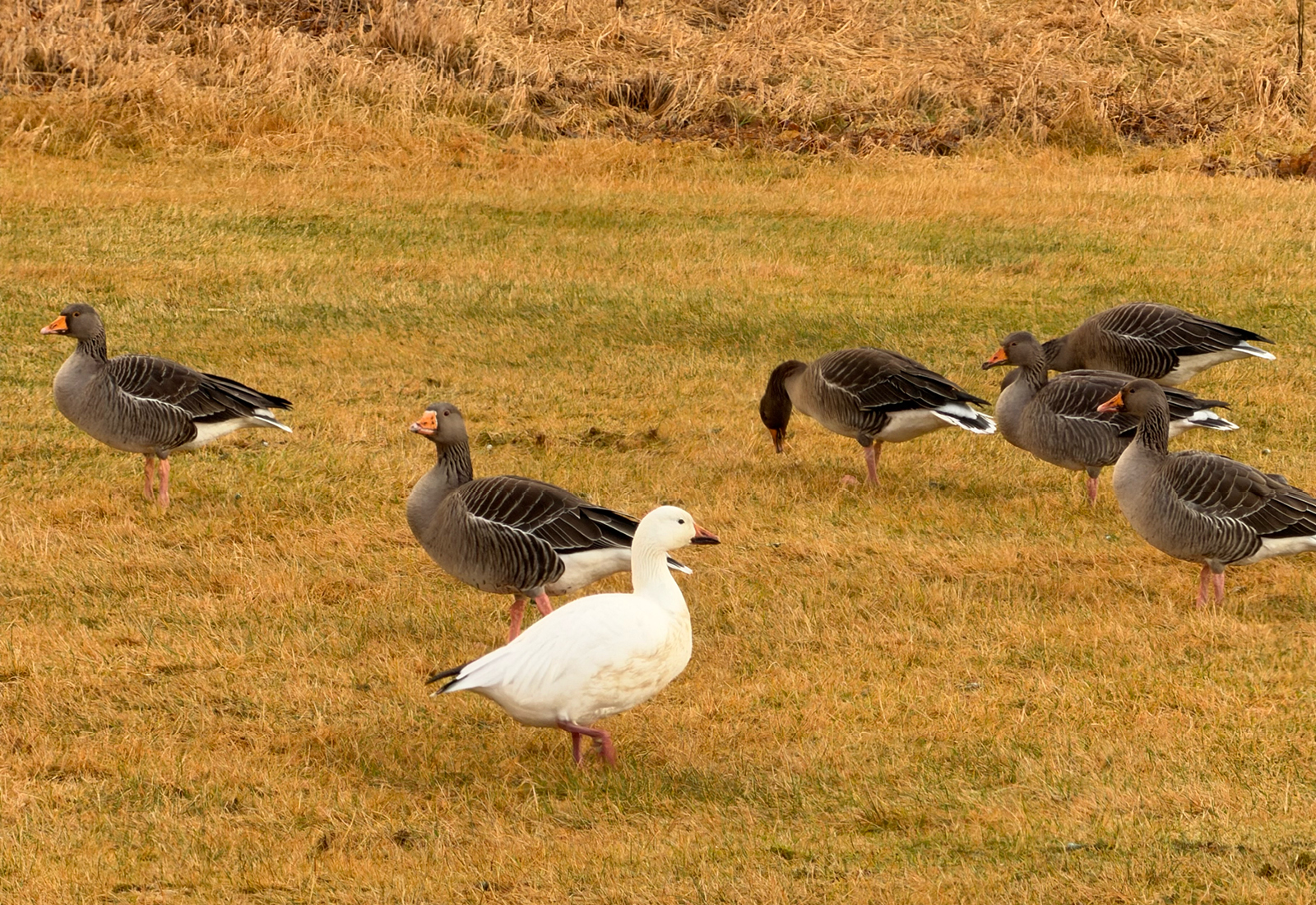 Auðvelt er að þekkja snjógæsina á alhvítum búknum og svörtum ystu vængfjöðrum sem mynda skarpa andstæðu þegar hún lyftir sér til flugs. Með henni í Grófinni eru heiðagæsir, algeng tegund á Íslandi, sem gera litamuninn enn meira áberandi.