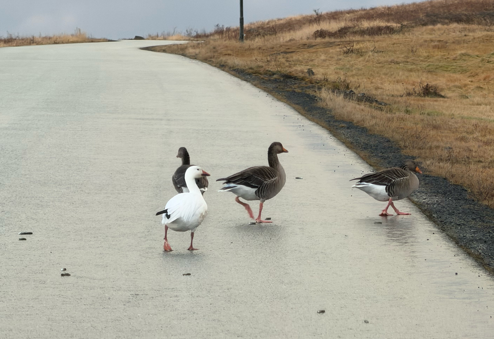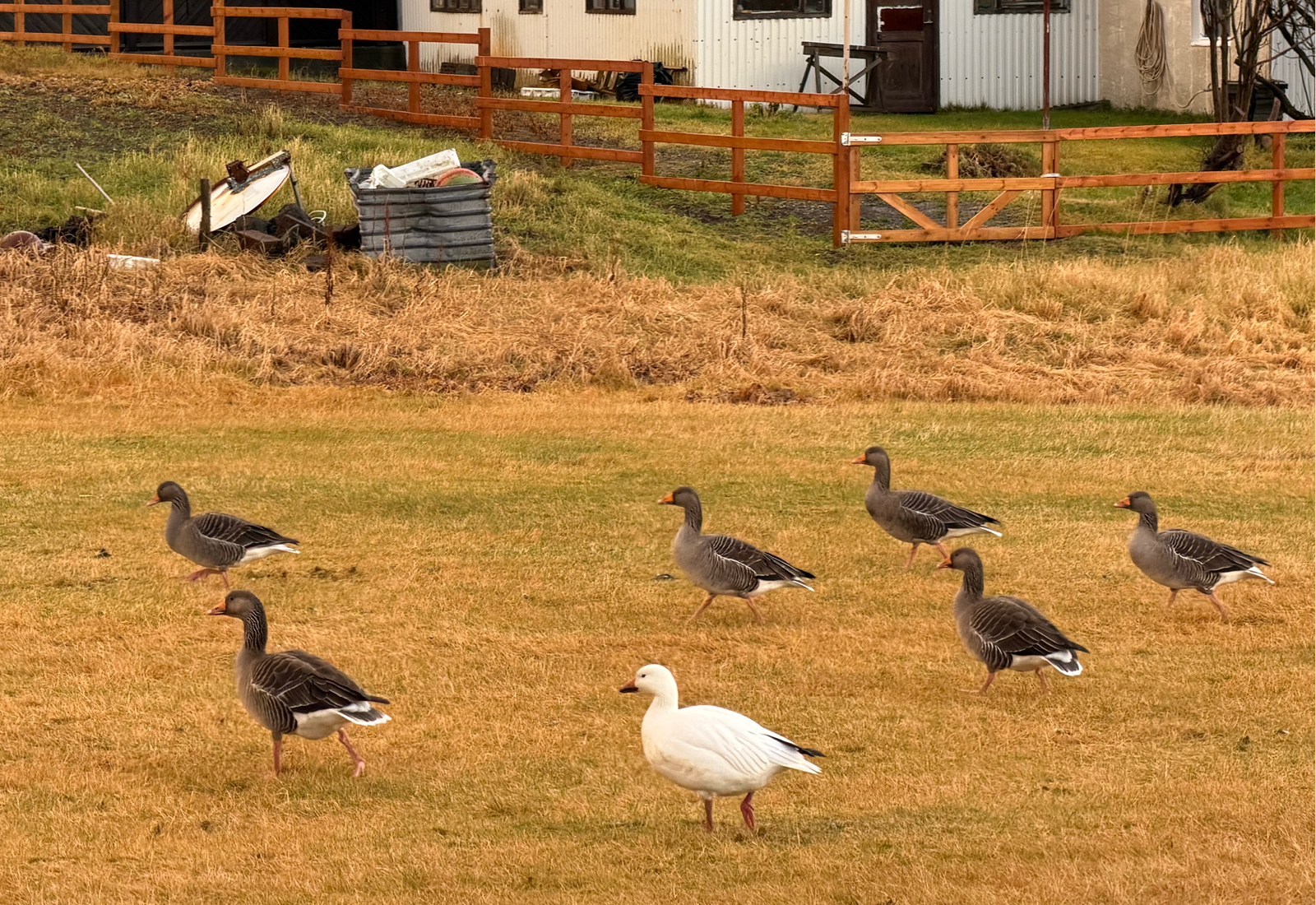 Fuglaáhugamenn tóku fyrst eftir gæsinni í gær, þar sem hún kroppaði rólega í grasið með gráum félögum sínum. Hún var enn á svæðinu í dag og sýnir engin fararsnið, þrátt fyrir talsverðan umgang á svæðinu.