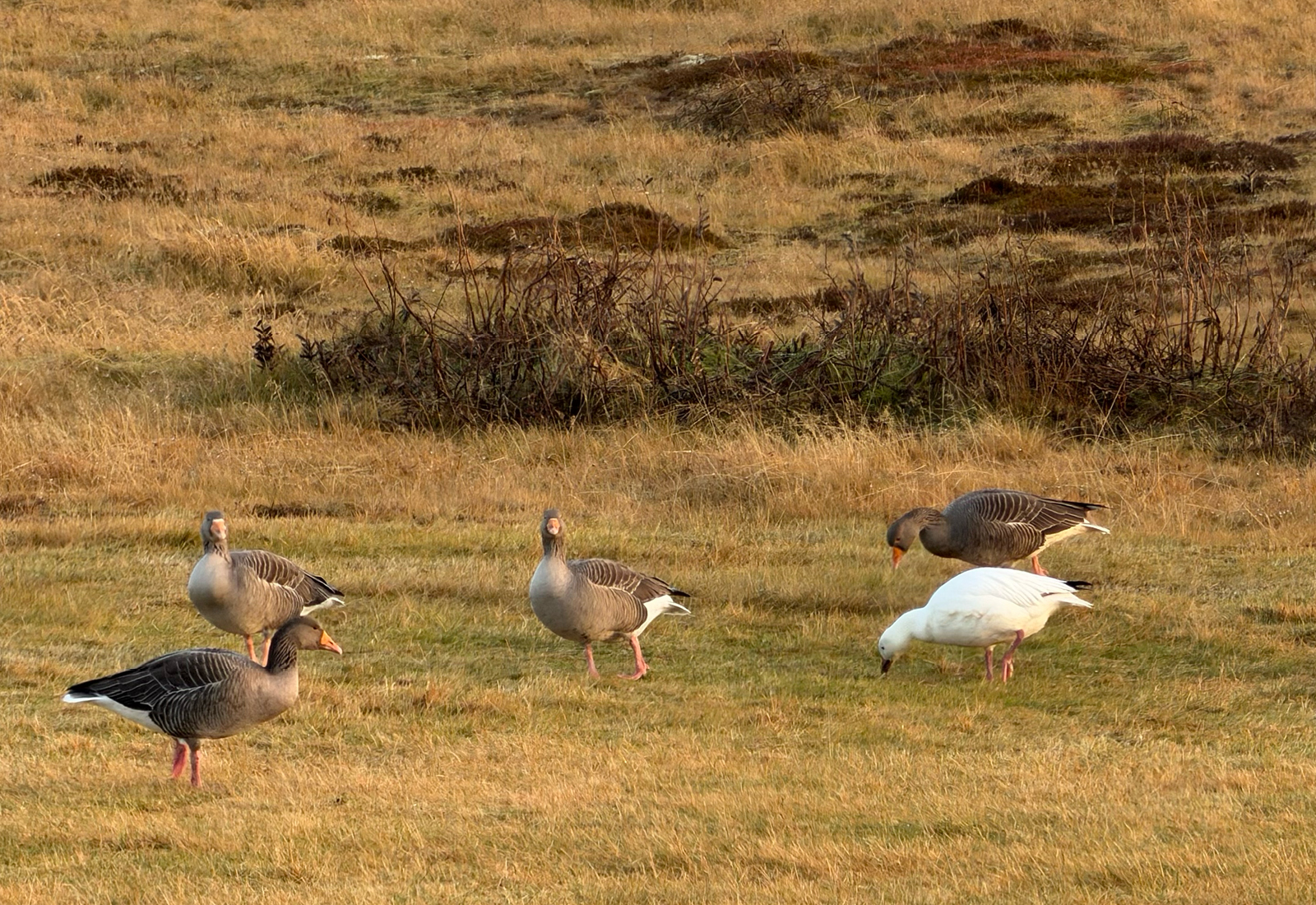 Snjógæs sækir í félagsskap heiðagæsa í Grófinni