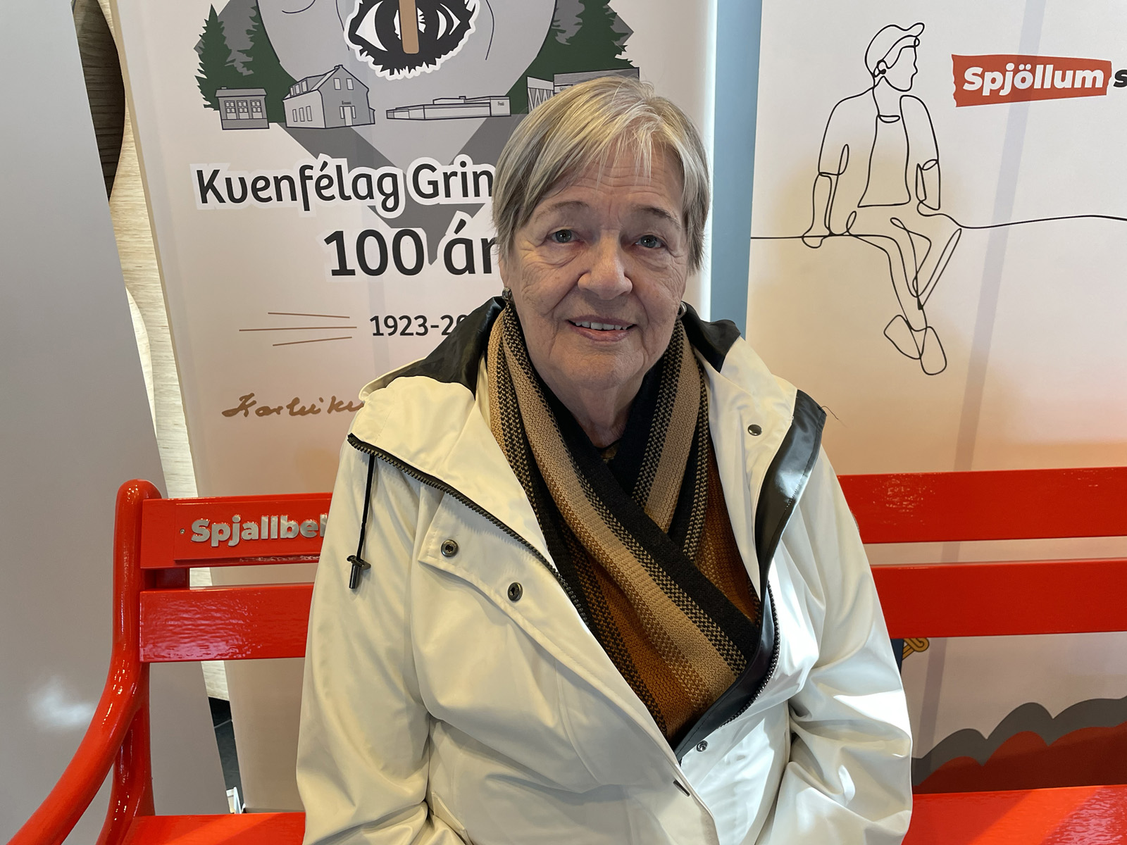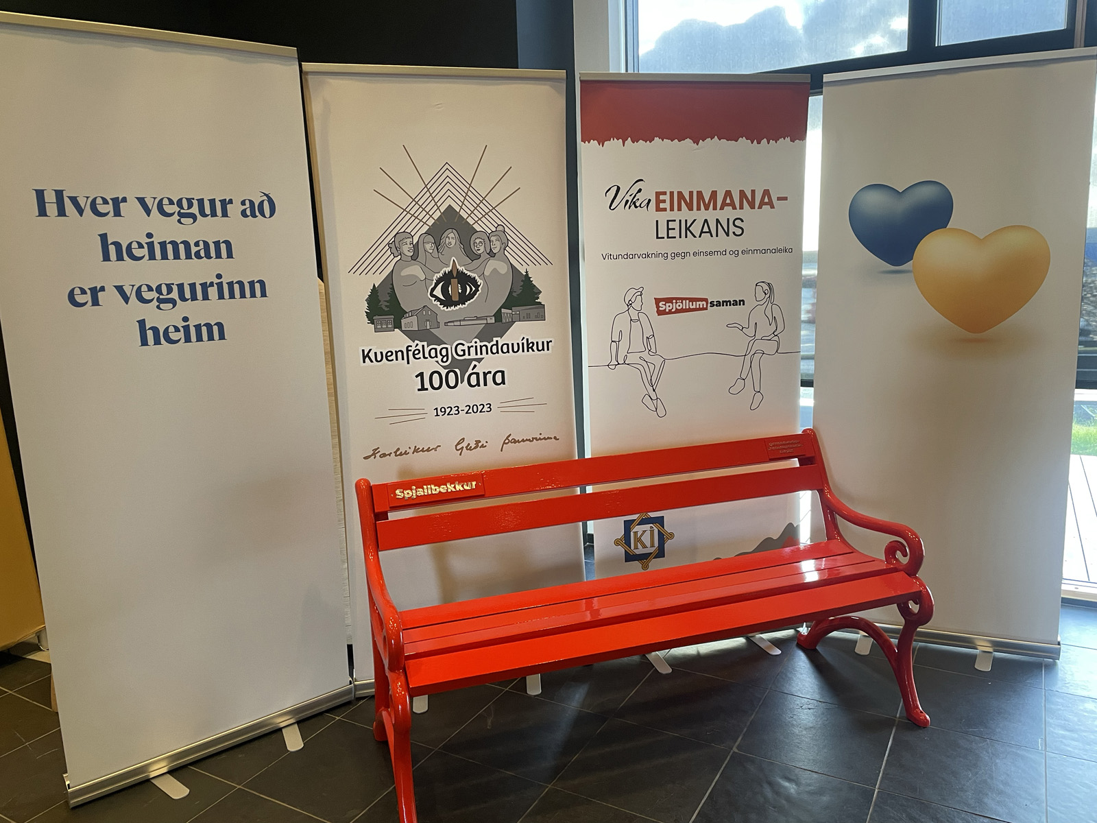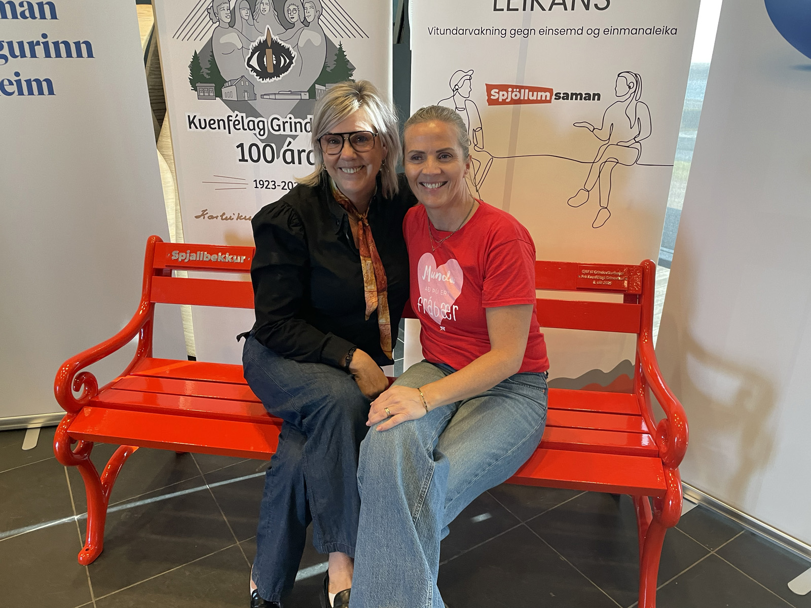 „Hvetjum alla til að setjast á bekkinn, spjalla við náungann og taka sjálfu,“ segir formaður Kvenfélags Grindavíkur, Sólveig Ólafsdóttir en kvenfélagið afhenti Grindavíkurbæ spjallbekk í tilefni af viku einmanaleikans sem var í október. Afhendingin fór fram í Kvikunni, menningarmiðstöð Grindvíkinga og voru fjölmargir Grindvíkingar mættir til að hlýða á erindin sem voru flutt en fyrir utan Sólveigu sem afhenti bekkinn tóku Jenny Jóakimsdóttir, verkefnastjóri einmanaleikans, og Ásrún Helga Kristinsdóttir, forseti bæjarstjórnar, til máls en samkomunni lauk með erindi Önnu Steinsen frá KVAN en í því kom hún inn á jákvæð samskipti og hvernig samskipti kynslóðanna hafa breyst í aldanna rás. Þau voru ófá hlátrasköllin sem ómuðu í Kvikunni og fóru Grindvíkingar og aðrir glaðir heim.