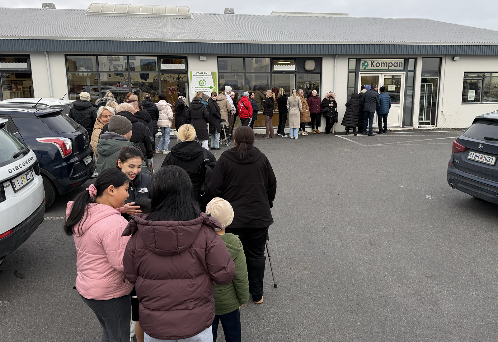 Það var löng röð utan við verslunina þegar hún opnaði kl. 13:00 í dag. Röðin var byrjuð að myndast fyrir hádegi.