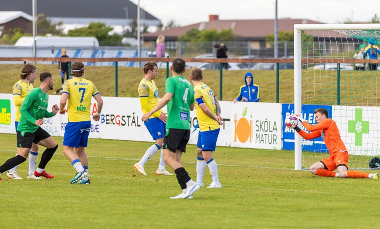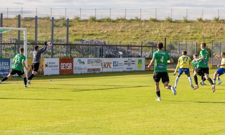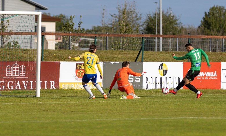 Heimamenn voru heppnir þegar stutt var til leiksloka en þá tók Fjölnir horn og Keflvíkingar hreinsuðu fram völlinn. Daníel Ingvar Ingvarsson, aftasti maður heimamanna, misreiknaði sig þá illilega og missti boltann framhjá sér og skyndilega var Axel Ingi Jóhannesson með boltann á eigin vallarhelmingi og allt autt fyrir framan hann. Axel tók sprettinn upp völlinn og þegar hann var kominn að markteig lét hann vaða – en þá var Daníel Ingvar búinn að hlaupa hann uppi og rétt náði að renna sér fyrir skotið og koma í veg fyrir mark.
