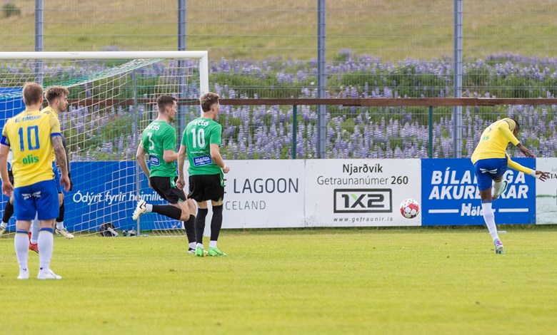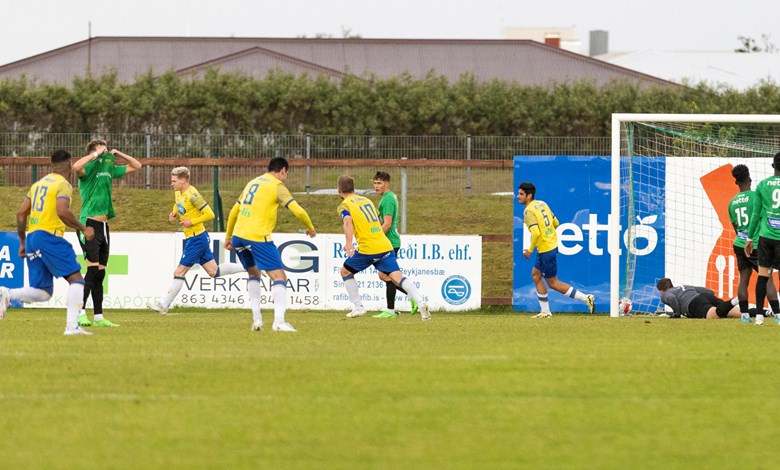 Markið kom upp úr aukaspyrnu Josip Krznaric sem sendi boltann inn á teig Njarðvíkinga. Breki Þór Hermannsson, sem var nýkominn inn á í sínum fyrsta leik fyrir Njarðvík, komst fyrir sendinguna en boltinn féll fyrir fætur Adams Árna Andersen sem afgreiddi hann viðstöðulaust í netið framhjá Aroni Snæ (83').