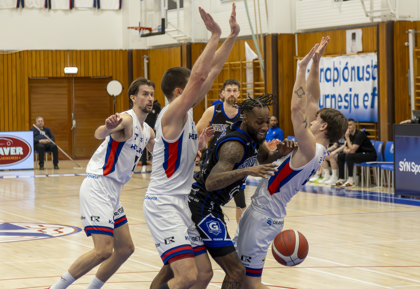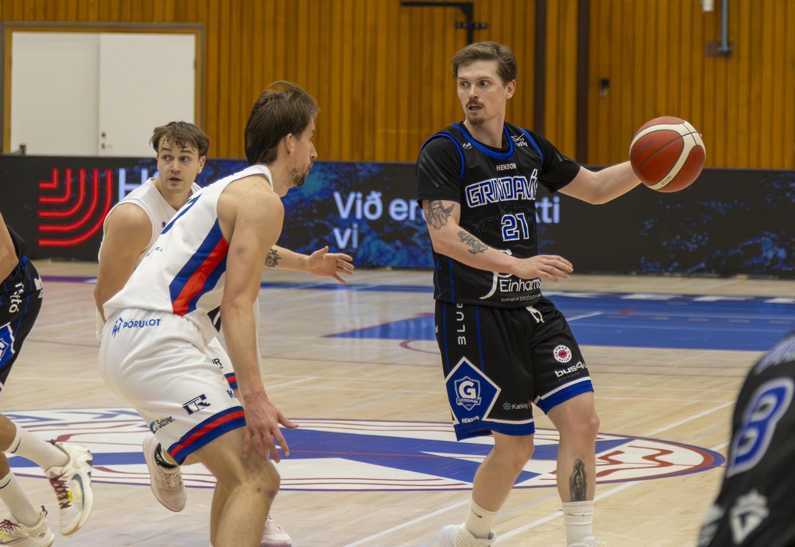 Hilmar Pétursson í harðri baráttu við Grindjána.