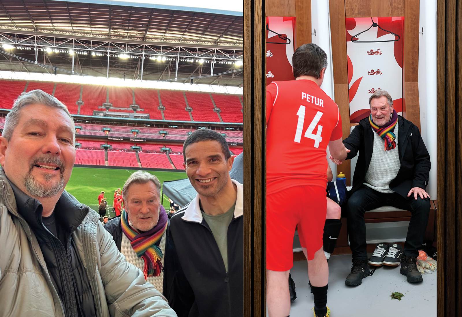 Pétur segir magnað að hafa upplifað þetta en leikmenn beggja liða voru svo sendir í búningsklefann þar sem þjálfarinn kynntist leikmönnum og skipulagði leikinn. „Við fengum okkar eigin búninga og alla þá þjónustu sem líklegast alvöru fótboltamenn fá að upplifa. Þar kynntist ég liðsfélögunum aðeins betur og kom í ljós að þeir voru flestir svipaðir gæjar og ég, gátu sparkað en ekki hlaupið mjög mikið. Flestir voru þarna í boðsferð og vildu bara hafa gaman, sem var léttir fyrir mig, en Glenn Hoddle heimtaði samt baráttu og sigur. Menn gengu svo úr búningsklefanum og út í göngin. Þaðan lá leiðin beint út á völl með svakalegum tilbrigðum, þar sem Champions League-lagið var spilað og menn klappaðir inn á miðjan völl af örfáum áhorfendum. Svo var stillt sér upp við enska þjóðsönginn og menn tókust svo í hendur.