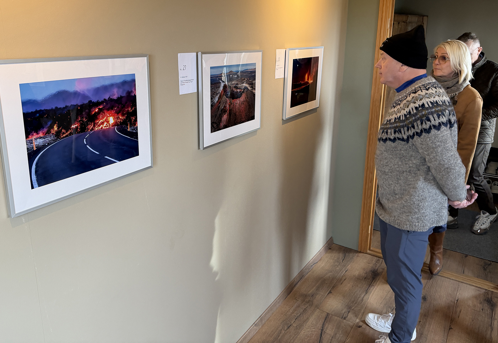 Jón Steinar Sæmundsson, áhugaljósmyndari úr Grindavík, opnaði í gær sýningu með 26 ljósmyndum úr eldgosunum á Reykjanesskaga. Sýningin, sem ber heitið „Gos með augum Grindvíkings“, er sett upp í Breiðagerði á Vatnsleysuströnd í rými sem kallast Gallerý Geit.