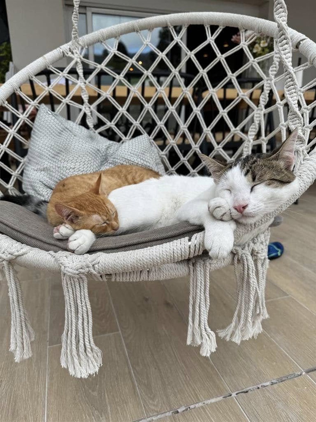 Á veröndinni liggja Póló og Simba í skjóli pálmatrjánna. Lífið á Tenerife virðist ekki aðeins hafa heillað fjölskylduna heldur líka kettina sem nú njóta lífsins í sínu eigin sólríka ævintýri.