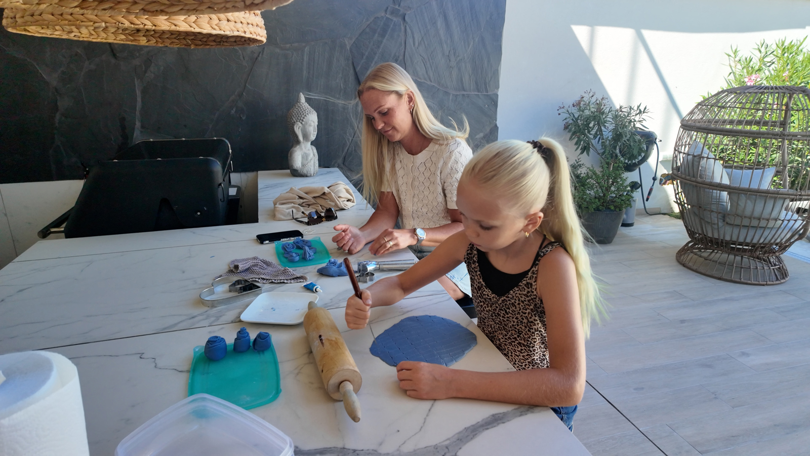 Á meðan við tölum liggja kettirnir Póló og Simba úti á veröndinni, hálfsofandi í sólinni. Skyndilega þýtur Póló af stað, eltir eðlu undir útigrillið á þaksvölunum og hefur betur í viðureigninni.