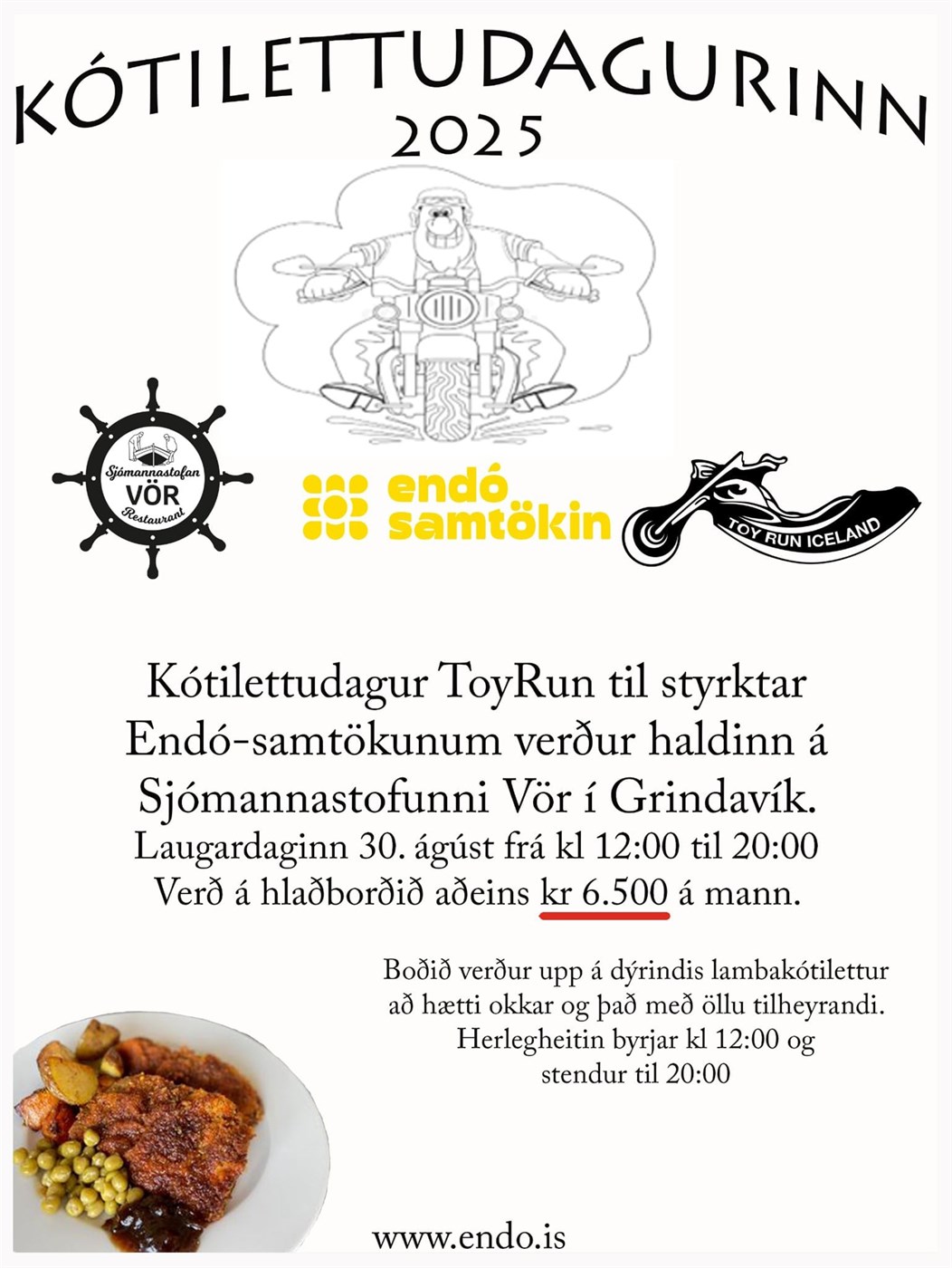 Það hefur verið árvisst hjá okkur að halda kótilettudag, höldum hann núna hjá Villa á Sjómannastofunni Vör en við vorum á Salthúsinu þar á undan en það er ekki hægt lengur. Villi verður með lambakótilettuhlaðborð frá 12:00 til 20:00 og vonumst við eftir að flestir ef ekki allir mótorhjólamenn og -konur fái sér túr til Grindavíkur, hitti okkur, fái sér gott í kroppinn og láti gott af sér leiða. Að sjálfsögðu eru allir velkomnir, ekki bara mótorhjólafólk. Það halda margir að ToyRun sé bara fyrir mótorhjólafólk, því fer víðsfjarri, þetta er fyrir alla sem vilja láta gott af sér leiða í góðgerðarstarfsemi,“ sagði Gylfi að lokum.