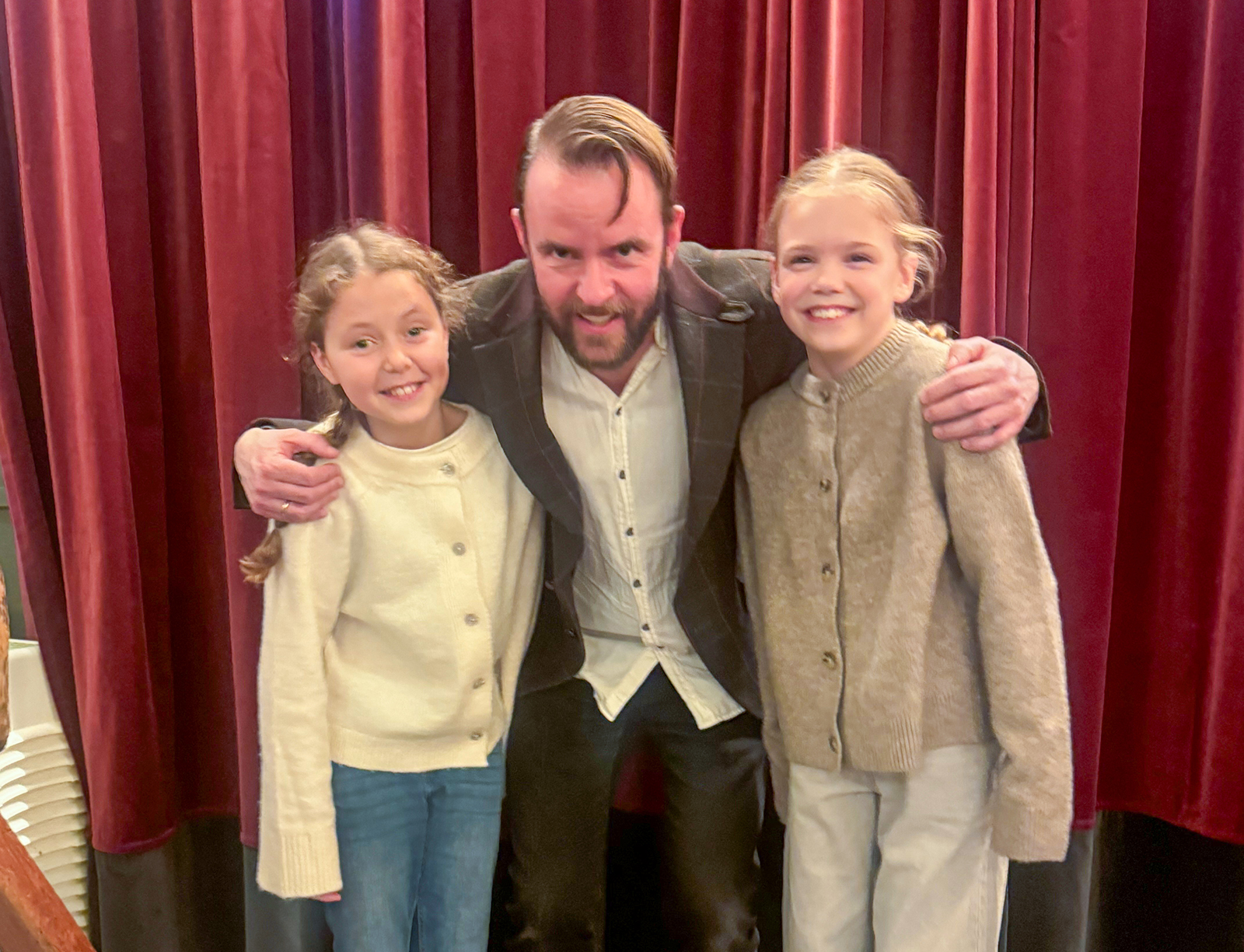 „Við erum búnar að læra hann allan en stundum gleymum við og þá hjálpum við hvor annarri,“ segja þær. „Æfingin skapar meistarann.“ Auk leikara eru fleiri fullorðnir að styðja við hópinn. Svo er barnapía í leikhúsinu sem passar upp á þær þegar á þarf að halda.