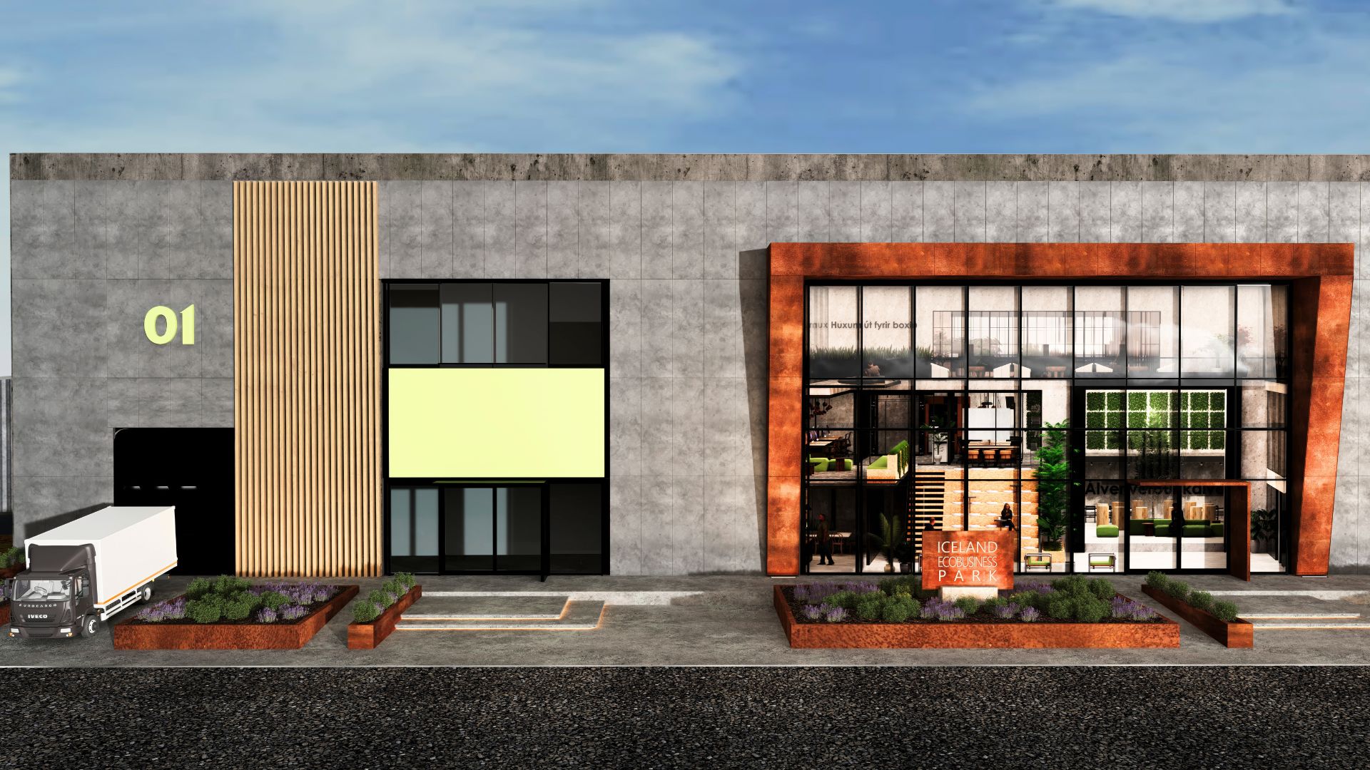 Í stað þess að gerbreyta núverandi iðnaðarhúsnæði byggir sýnin á því að aðlaga bygginguna að umhverfinu með tilliti til orkunýtni og varanleika. Lögð er áhersla á samfellu við núverandi steinsteypuvirki með notkun trefjasementplatna og utanáliggjandi einangrunarkerfis sem dregur úr orkunotkun án þess að raska burðarvirki eða innra rými hússins. Miðpunktur hönnunarinnar er hjarta iðngarðsins sem afmarkast af stálgrind og klæðningu úr kortenstáli, en það skapar sterkt en jafnframt hógvært byggingarlistaverk sem eldist vel með tímanum.