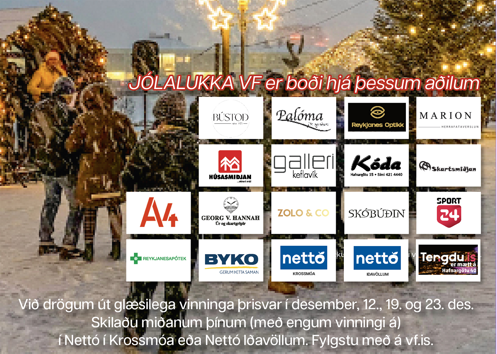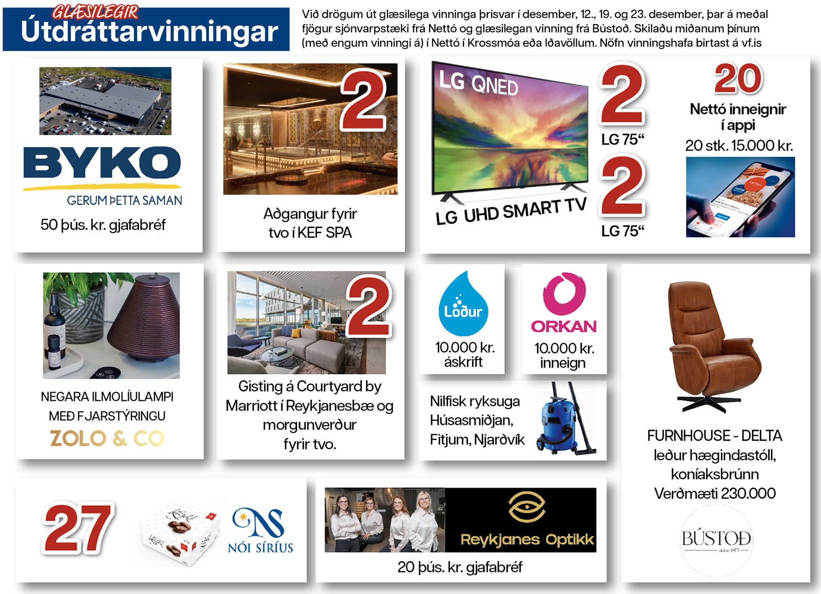 Þá verða sextíu vinningar í þremur útdráttum í desember en dregið verður úr miðum (með engum vinningi á) sem skilað er í Nettó verslanir í Njarðvík og Keflavík. Stærsti útdráttarvinningurinn er glæsilegur hægindastóll frá Bústoð í Keflavík, fjögur Smart LG-sjónvörp auk tuttugu 15 þús. kr. inneignarvinninga frá Nettó. Nöfn vinningshafa verða birt á vf.is.